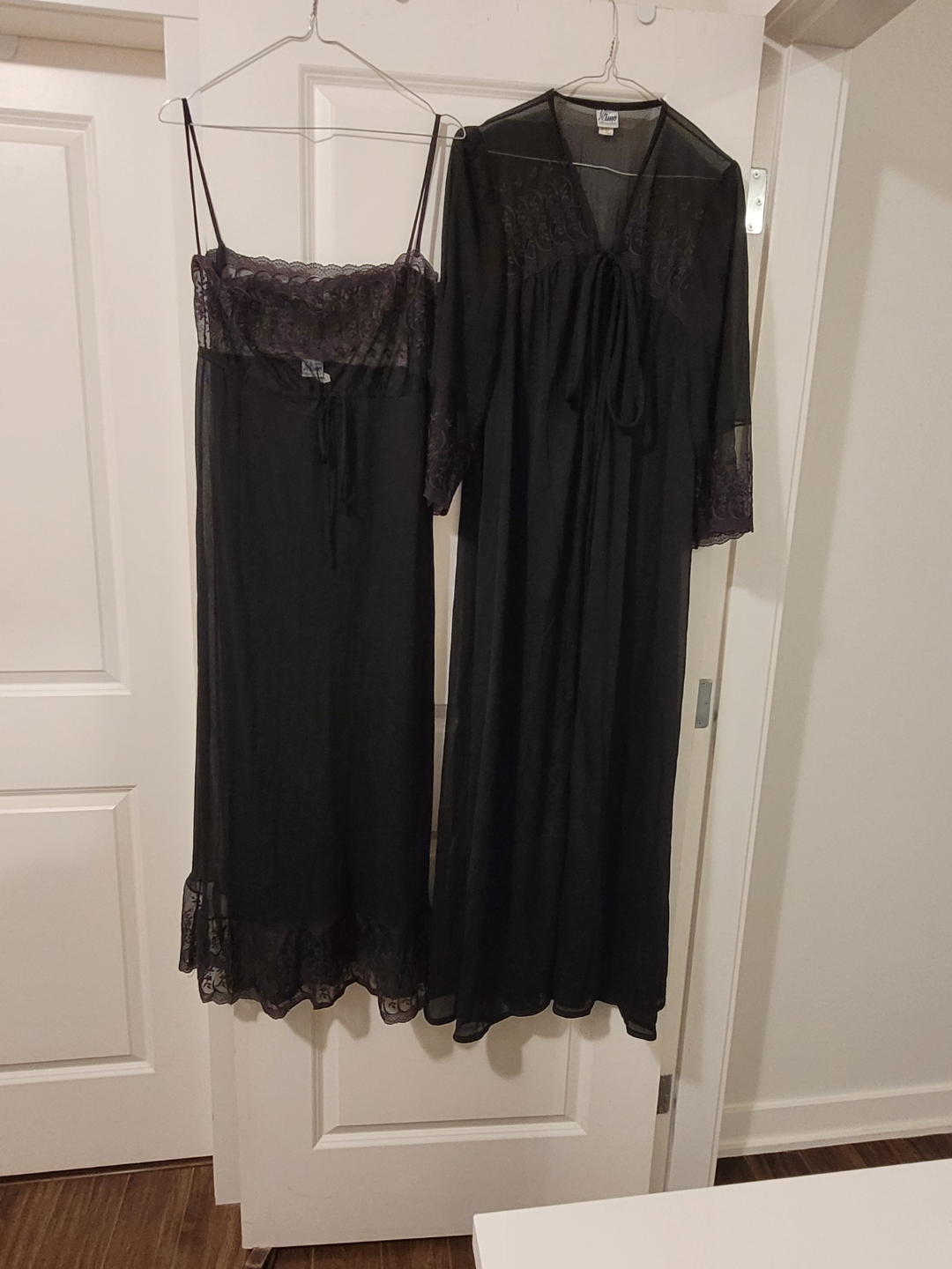 vintage Black nightgown and robe set. The robe features lace trim at the sleeves and neckline. The nightgown has spaghetti straps. A perfect set for a quiet night in.
