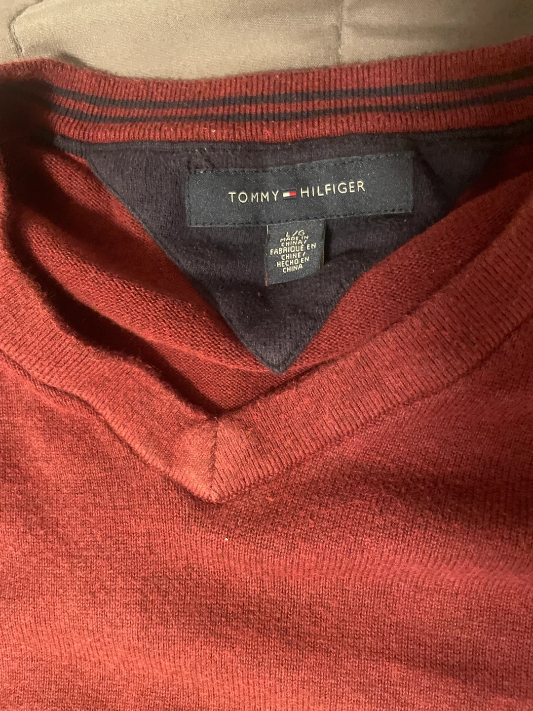 A classic Tommy Hilfiger V-neck sweater in a lovely red hue. It's a size large. This sweater's great for layering when the weather gets a bit cooler!