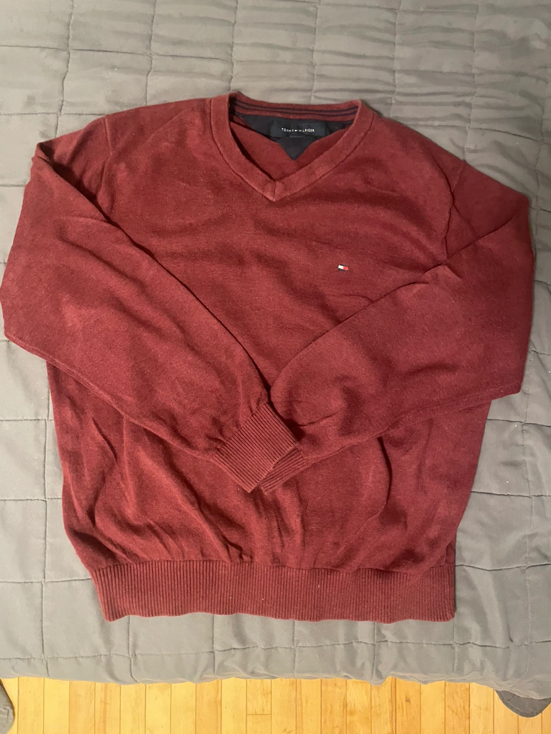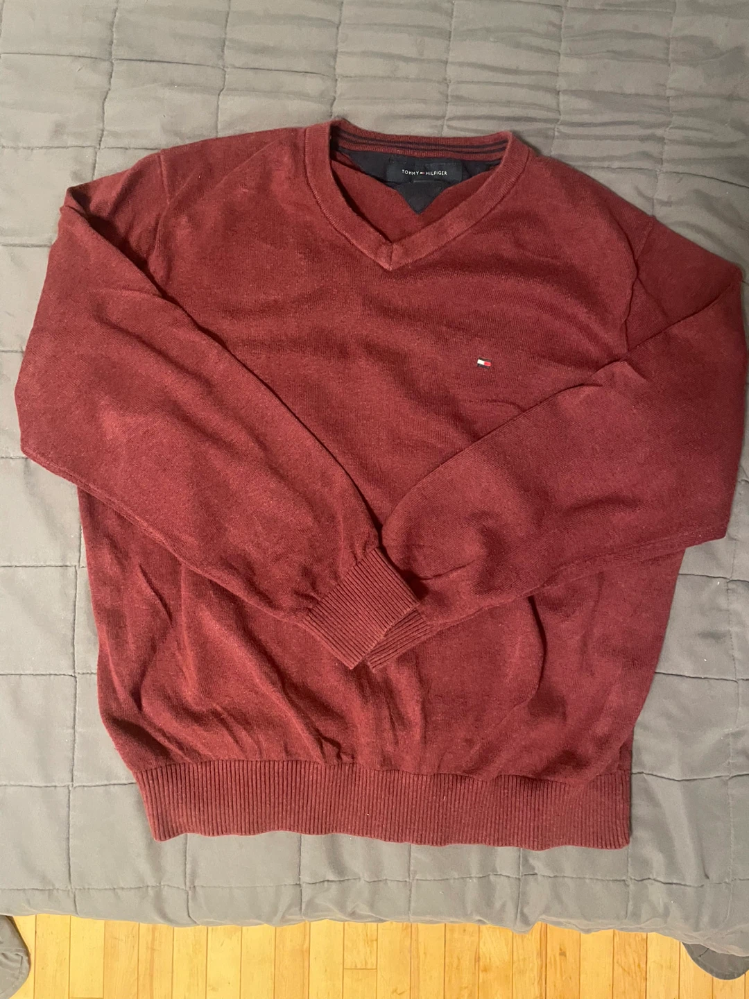 A classic Tommy Hilfiger V-neck sweater in a lovely red hue. It's a size large. This sweater's great for layering when the weather gets a bit cooler!