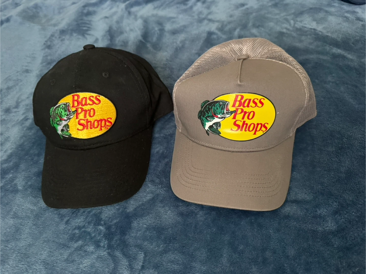 Two Bass Pro Shops hats for sale! One is black, and the other is gray with a mesh back. Both are in great condition and ready for a new owner.