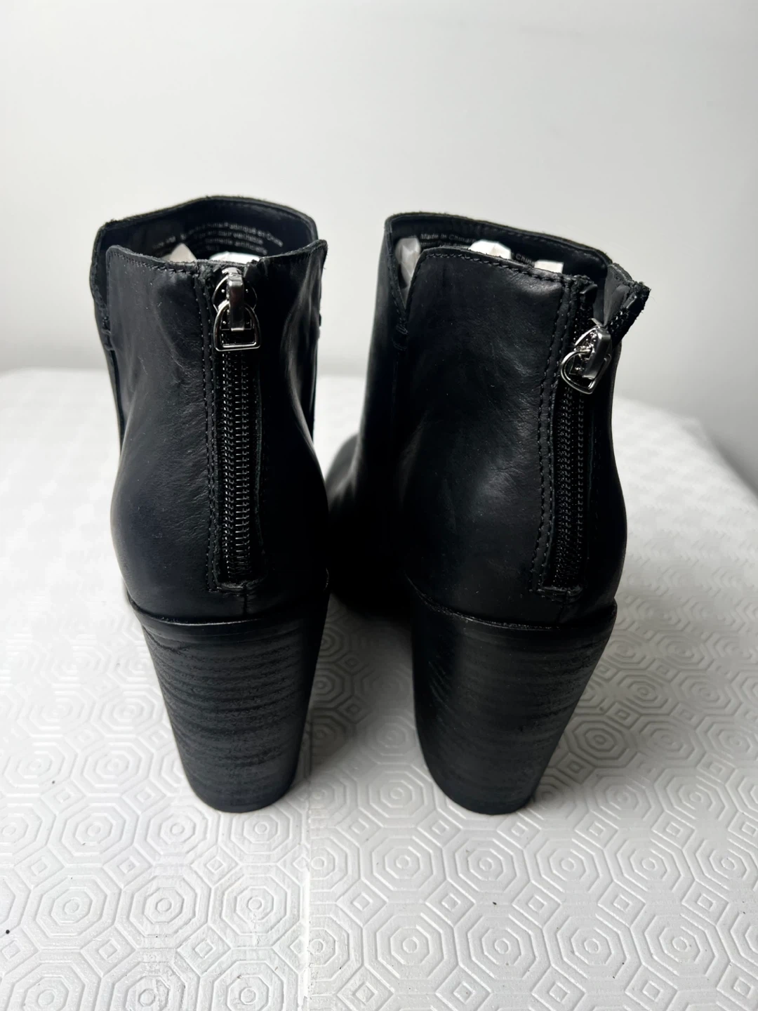 Chic black leather heeled booties from Open Edit These stylish boots feature a side zipper for easy on and off. Heel height is approximately 3 inches. Perfect for dressing up any outfit this fall!