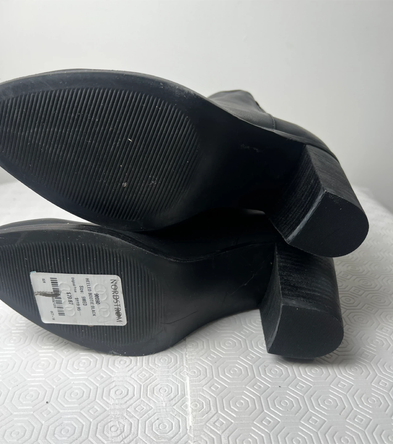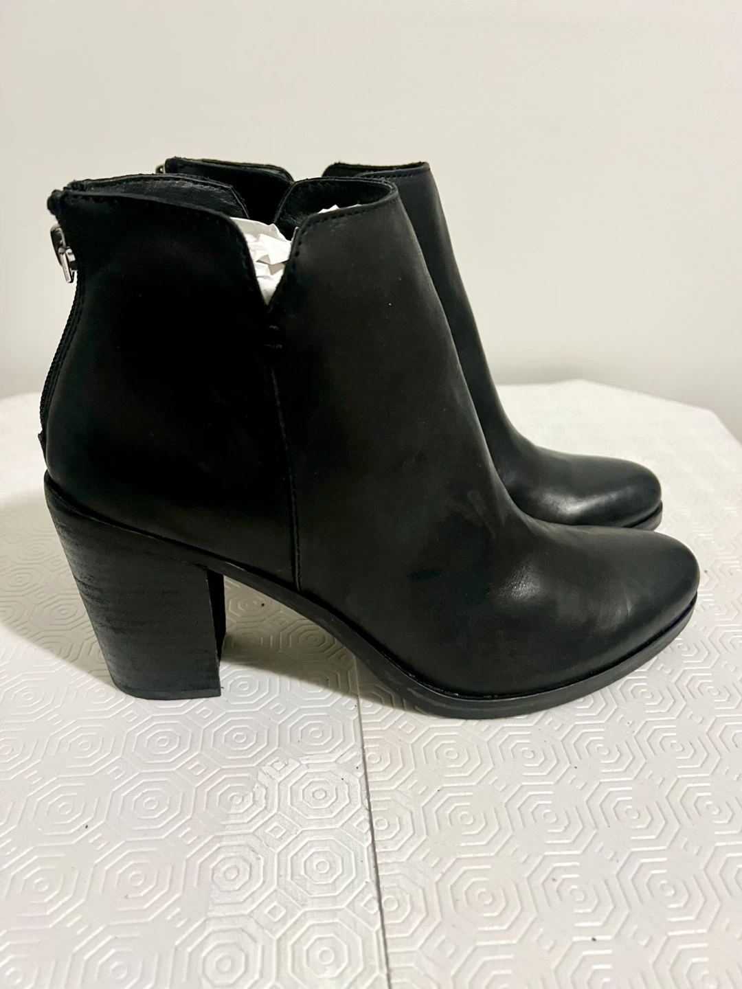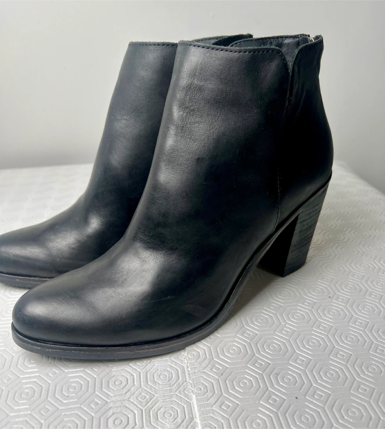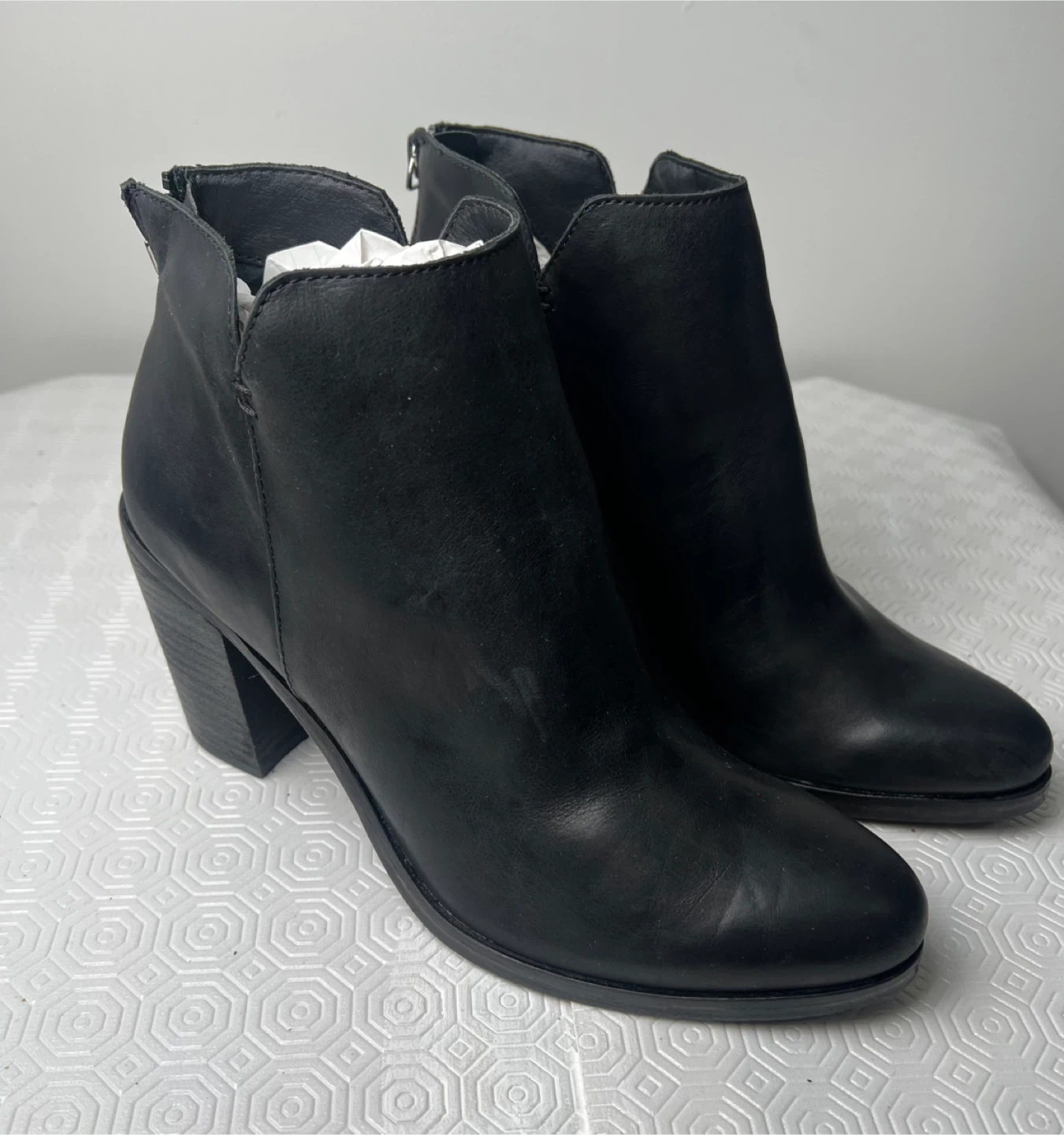 Chic black leather heeled booties from Open Edit These stylish boots feature a side zipper for easy on and off. Heel height is approximately 3 inches. Perfect for dressing up any outfit this fall!