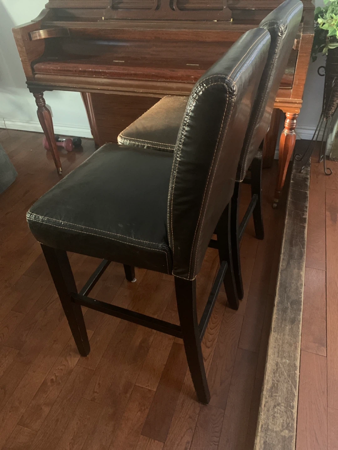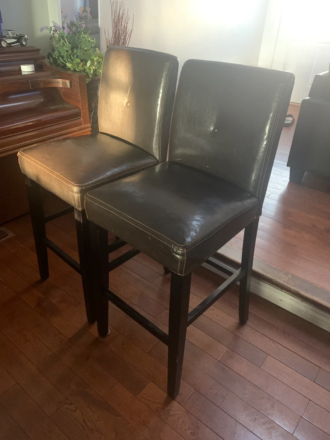 Selling a set of two black faux leather bar stools. These stools have a classic design with white contrast stitching. They're suitable for a kitchen island or bar area.