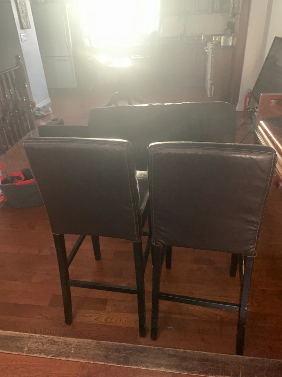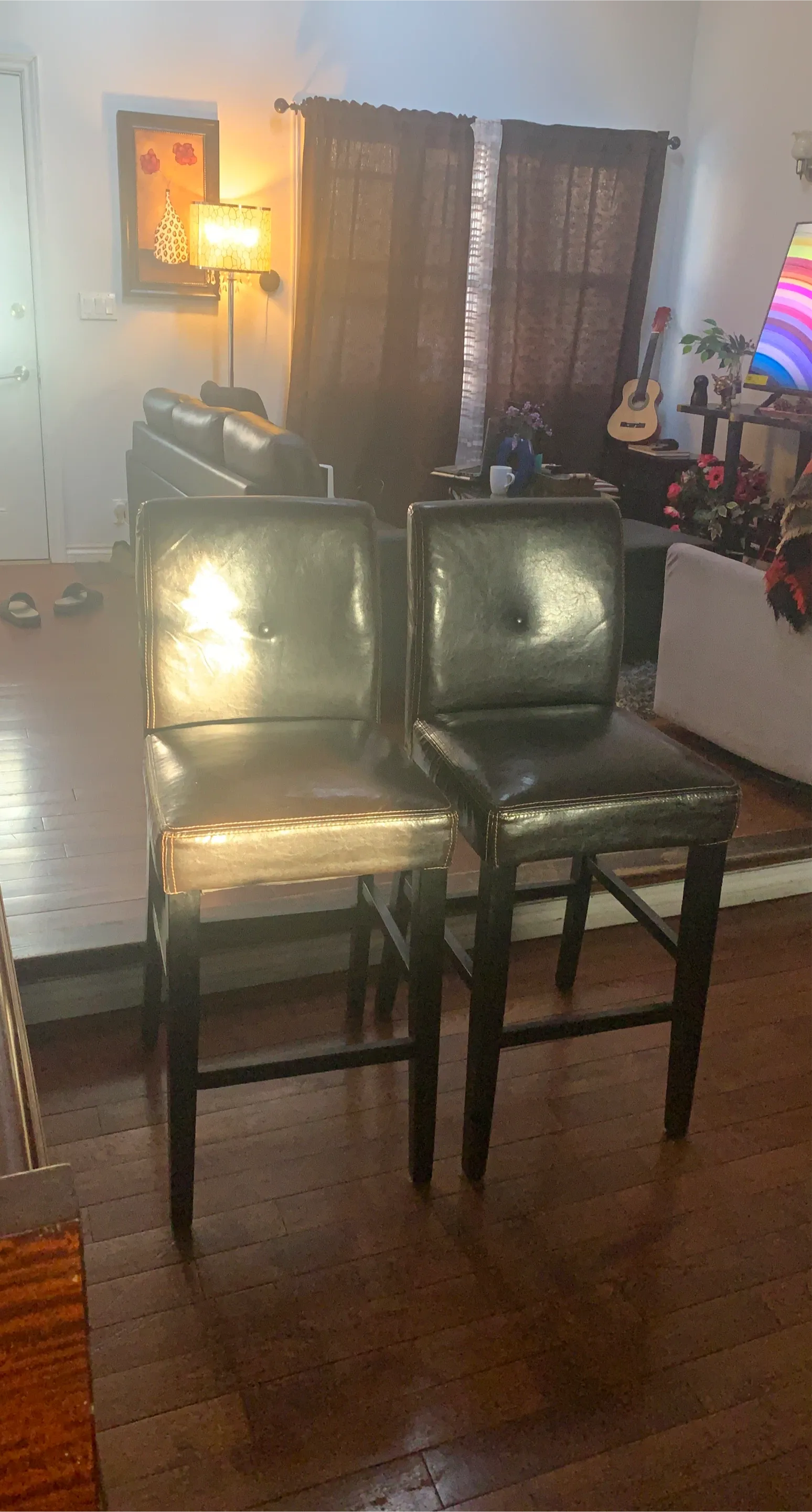 Selling a set of two black faux leather bar stools. These stools have a classic design with white contrast stitching. They're suitable for a kitchen island or bar area.
