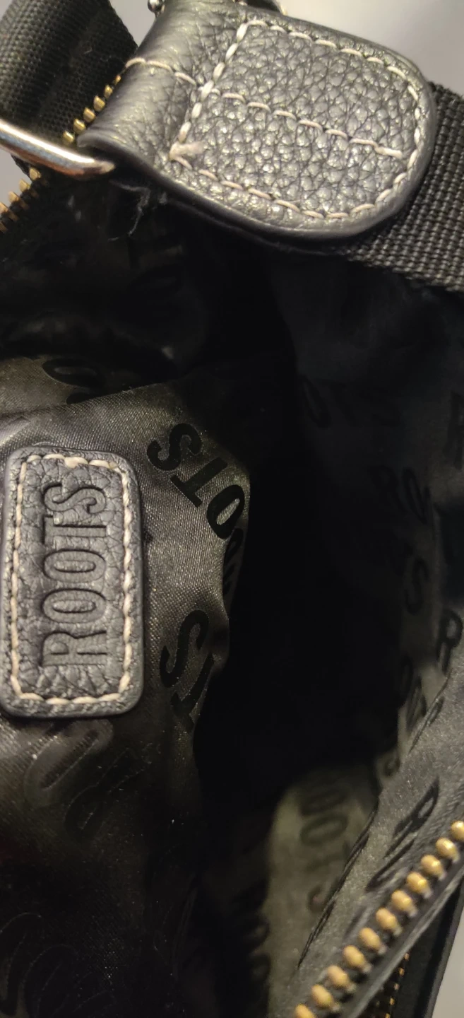 This is a black crossbody bag from Roots. It's made of genuine leather and material. Features multiple zippered pockets. A great everyday bag for essentials!. Price is firm. Bag is preowned so signs of minor wear should be expected