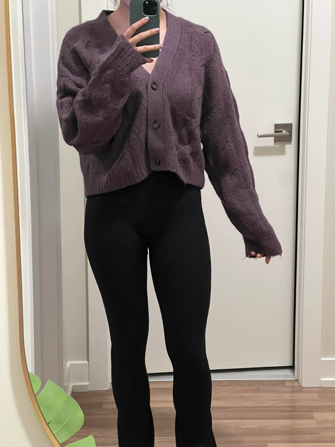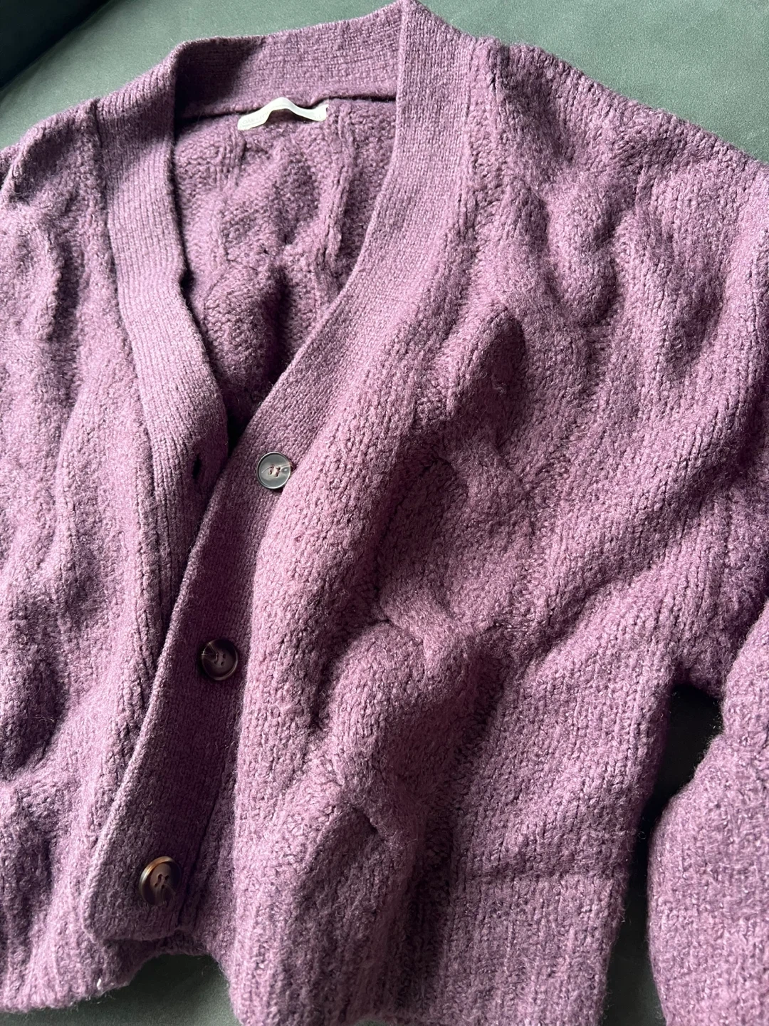 A cozy purple cardigan sweater with a textured knit. It features button-up closure.