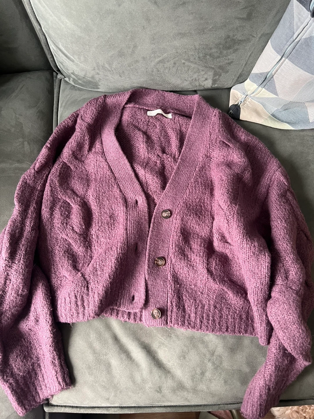 A cozy purple cardigan sweater with a textured knit. It features button-up closure.