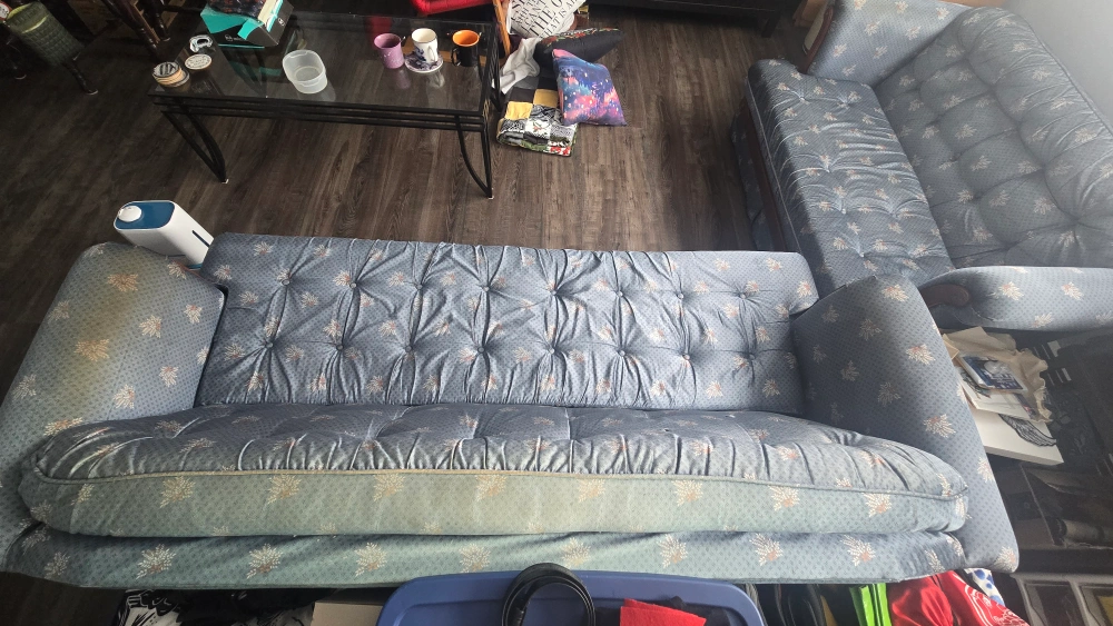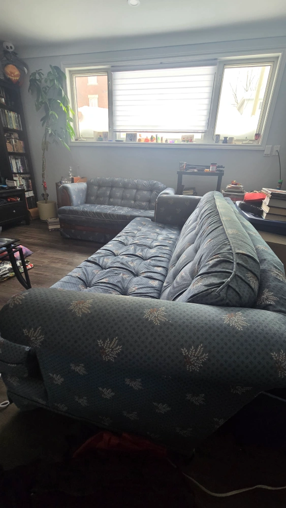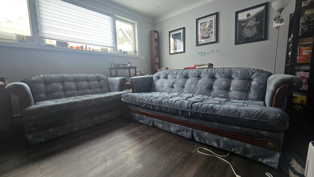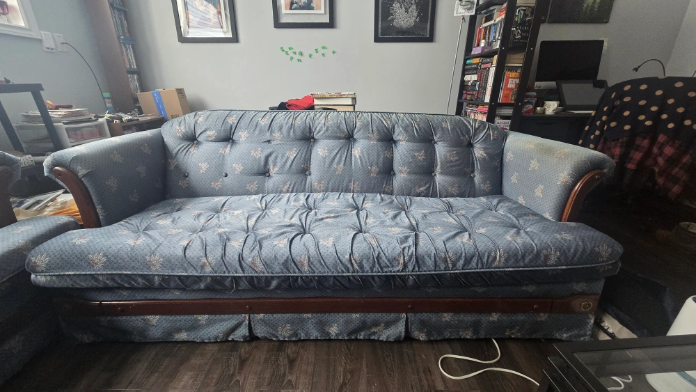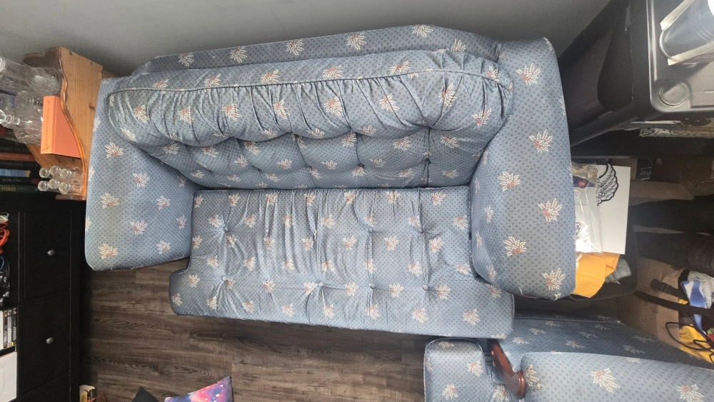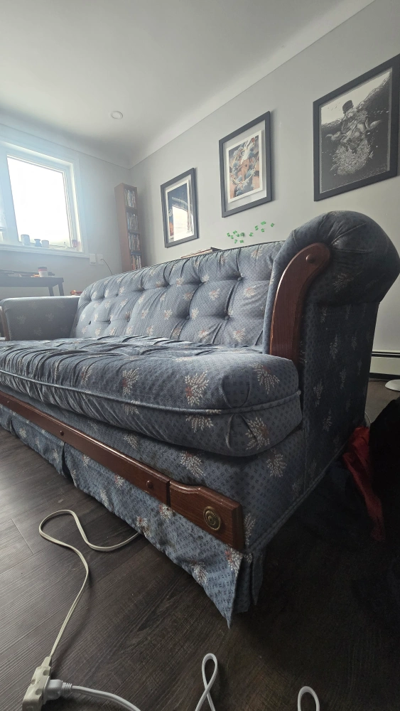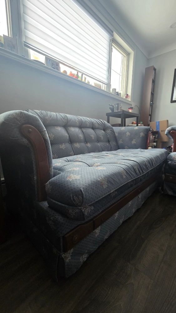 Beautiful vintage sofa and loveseat set with a blue floral pattern upholstery and dark wood frame. Well loved and extremely sturdy couch and loveseat set looking for a new home. Perfect for student housing, apartments, and beginner homes. Fabric is a little discoloured from the sun on couch arms and top but otherwise in good condition.