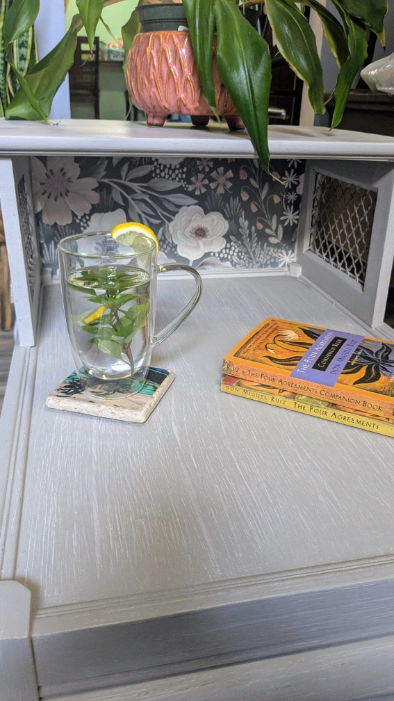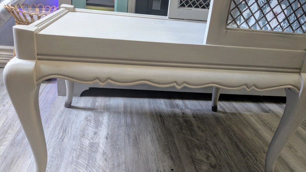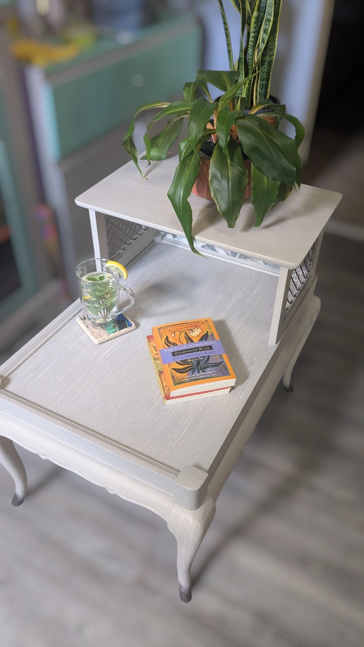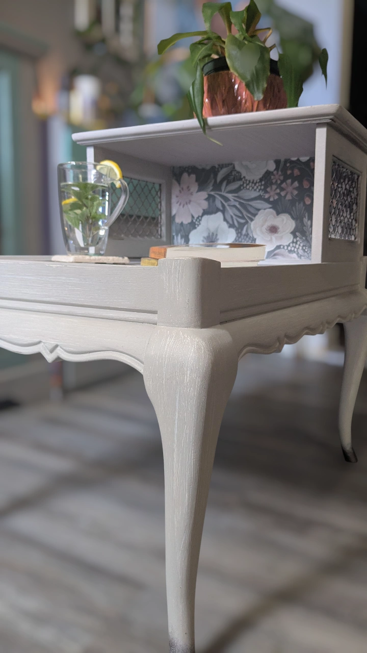 Vintage Holland House, tiered side table. Refinished in faux Pottery Barn finish (grey). Floral application, completely sealed. She's an original beauty.