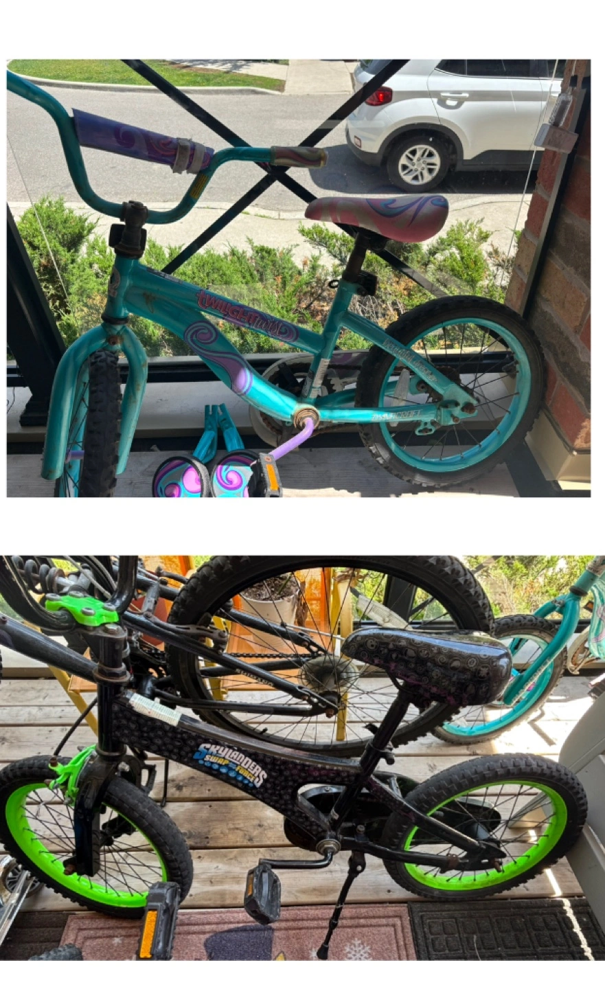 Selling two 16 Inch kids bikes, one for a boy and one for a girl, which are in good condition and perfect for kids aged 4-7 years. Girl’s bike : Turquoise and Purple, having bell and training wheels too. Boy’s Bike : Neon Green and black with easy grip handles, bike bell.