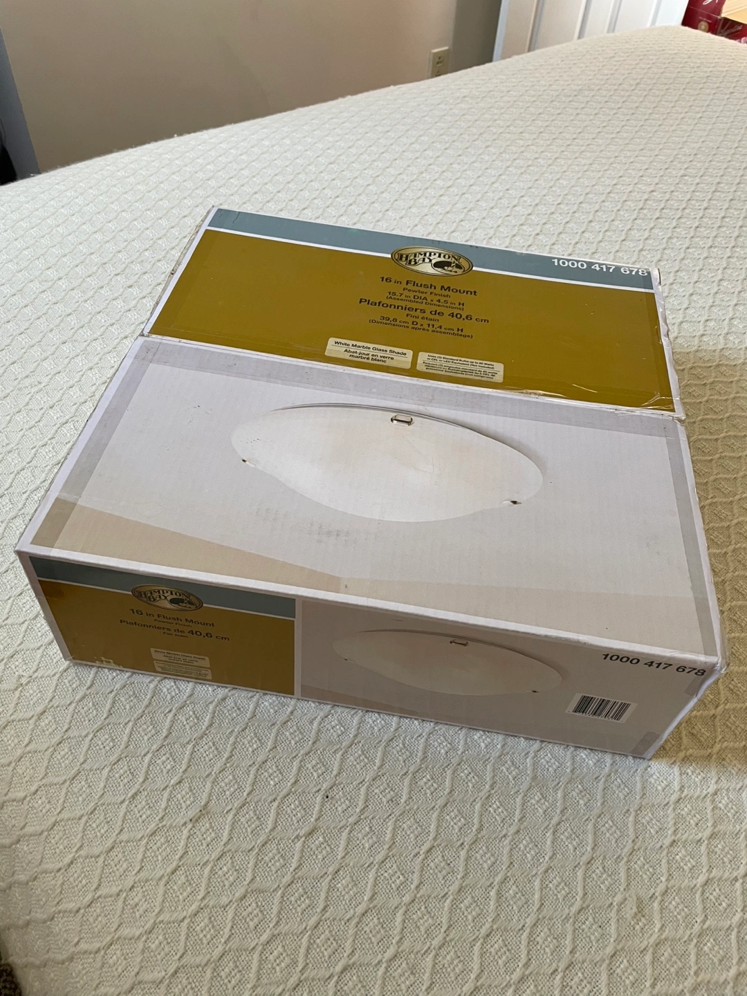 20New in box. White marble glass shade. Pewter finish. 15.7-inch diameter, 4.5-inch high.