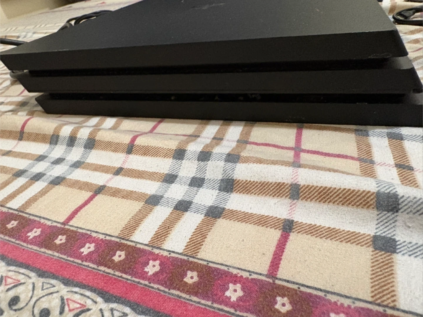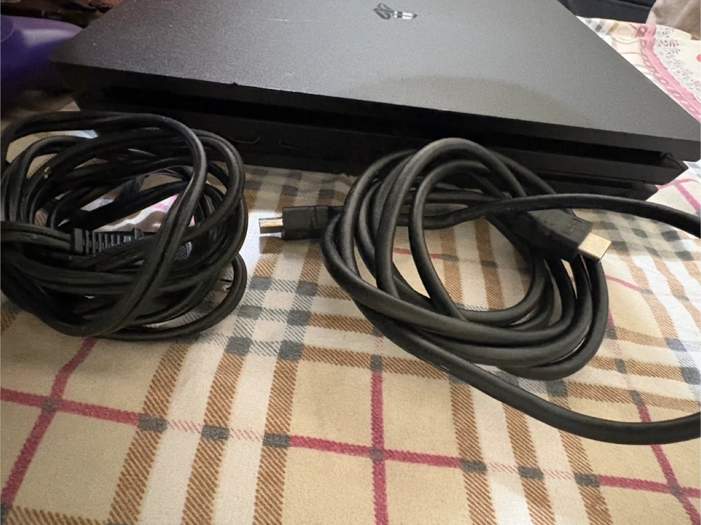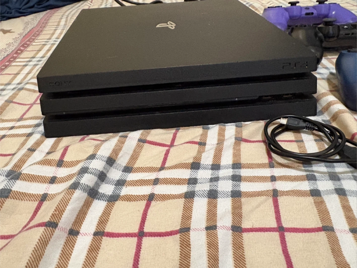 This is a Sony PlayStation 4 Pro 1TB console. It comes with three DualShock 4 controllers in blue, black, and purple. Includes power and HDMI cables.