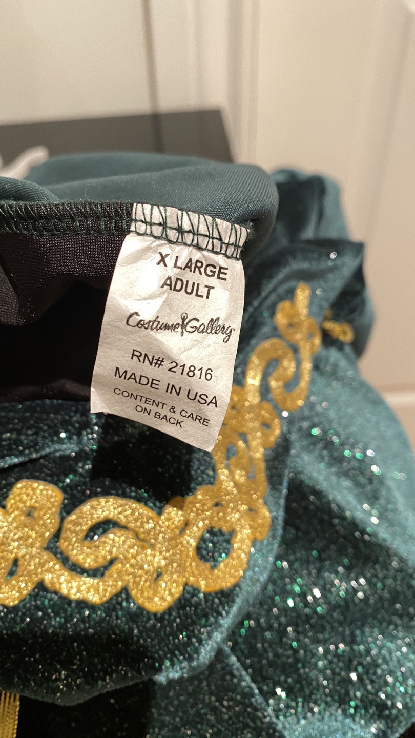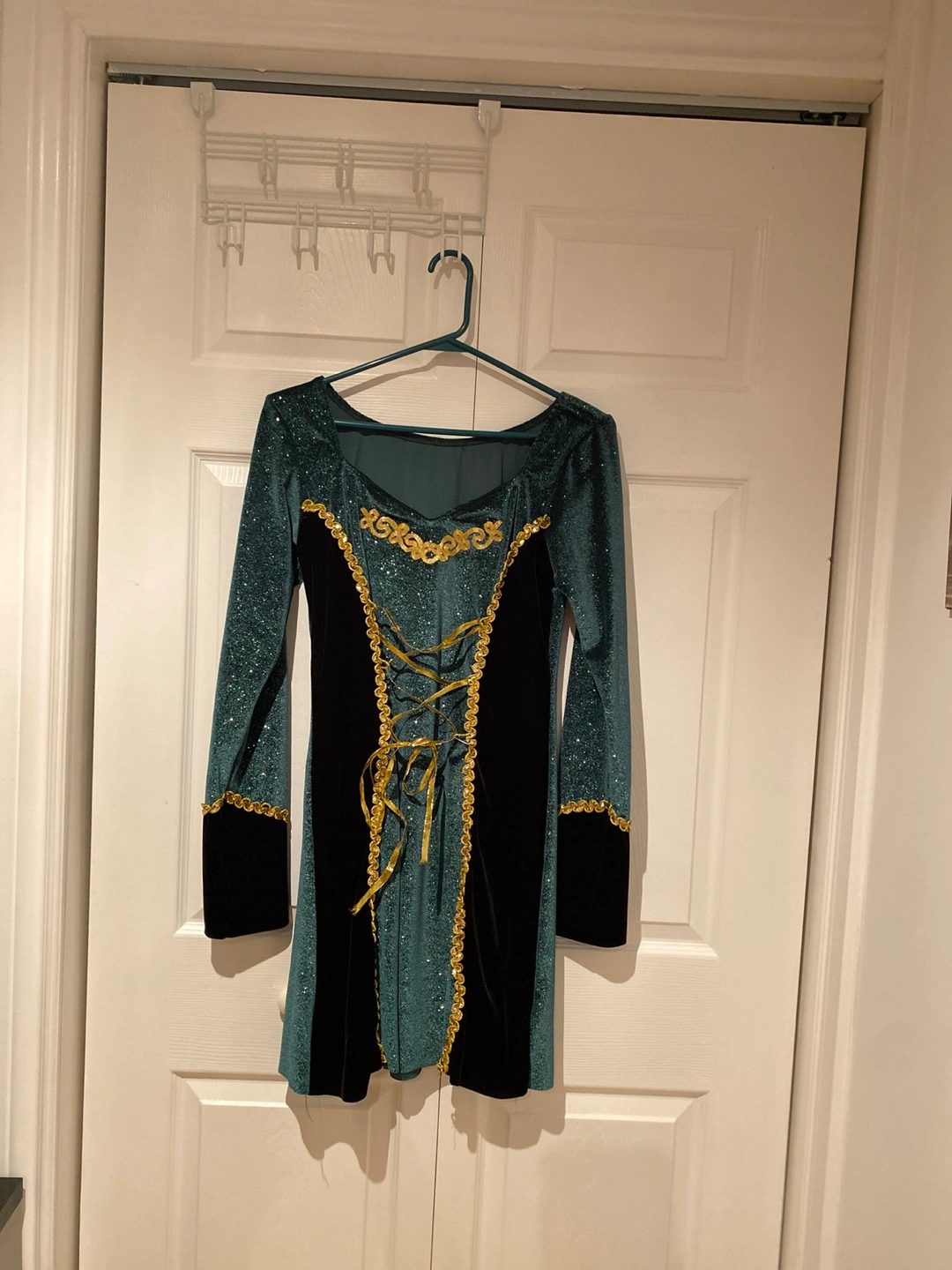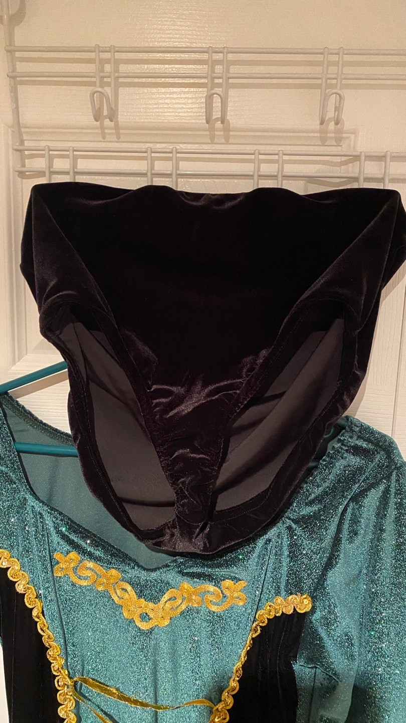 Green Velvet Dress with Gold Sequin trim. Includes black velvet under garment. Excellent pre-loved condition.