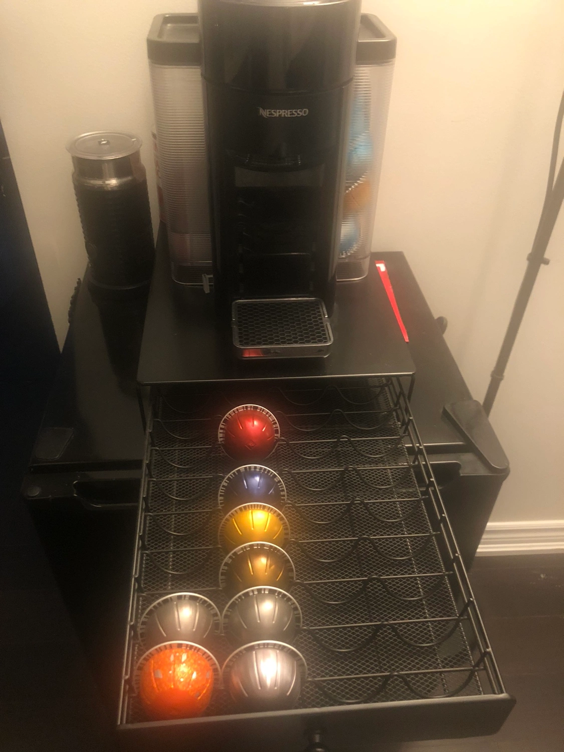 Used for less than a year. It’s a sleek drawer organizer that doesn’t take up too much space. This coffee drawer can sit right underneath the brewer, so you’re not losing any additional countertop space. Holds 40 coffee pods.