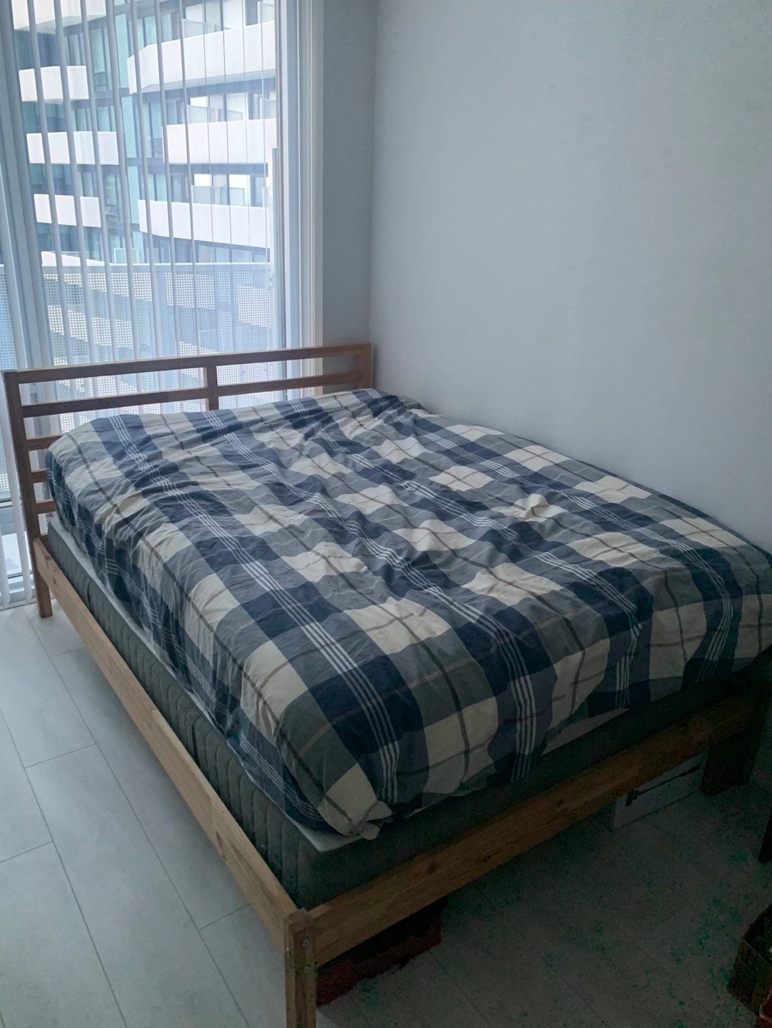 Pick up at harbour plaza residences. I will dissemble for moving into x2 length pieces x2 width pieces, x2 slated bases, support beam, and Headboard with hardware. Please bring someone to assist with moving the pieces.