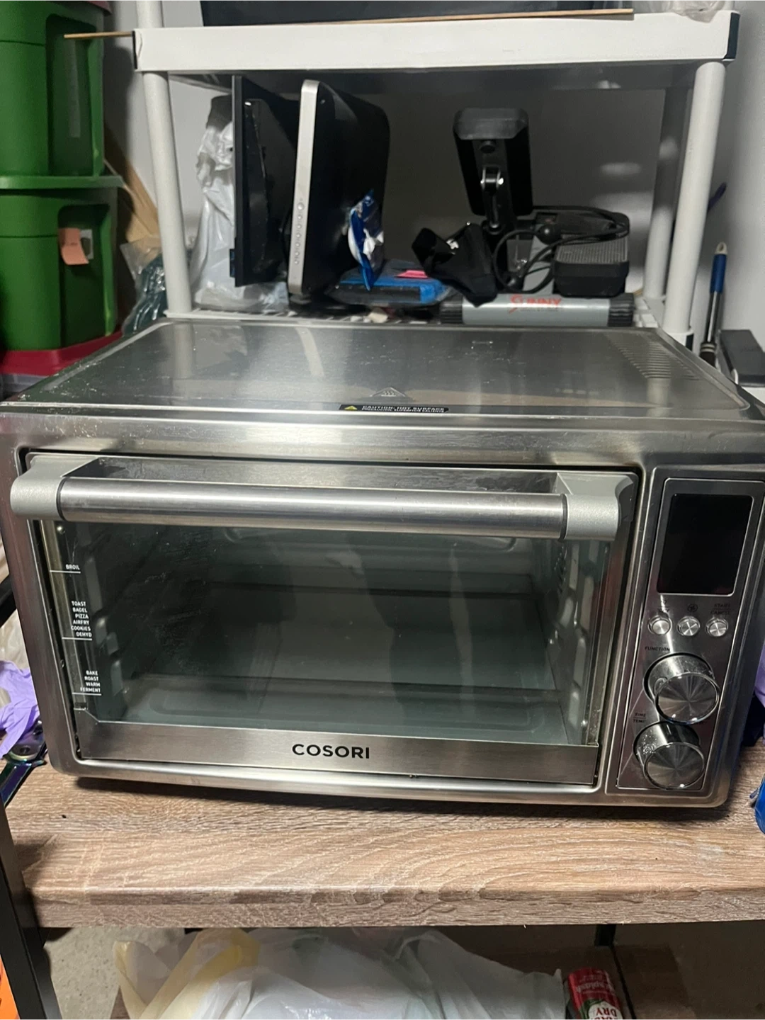 This is a COSORI toaster oven with air fryer capabilities. It comes with a wire rack, a crisper tray, and a baking pan. It's a versatile kitchen appliance for toasting, baking, broiling, and air frying.