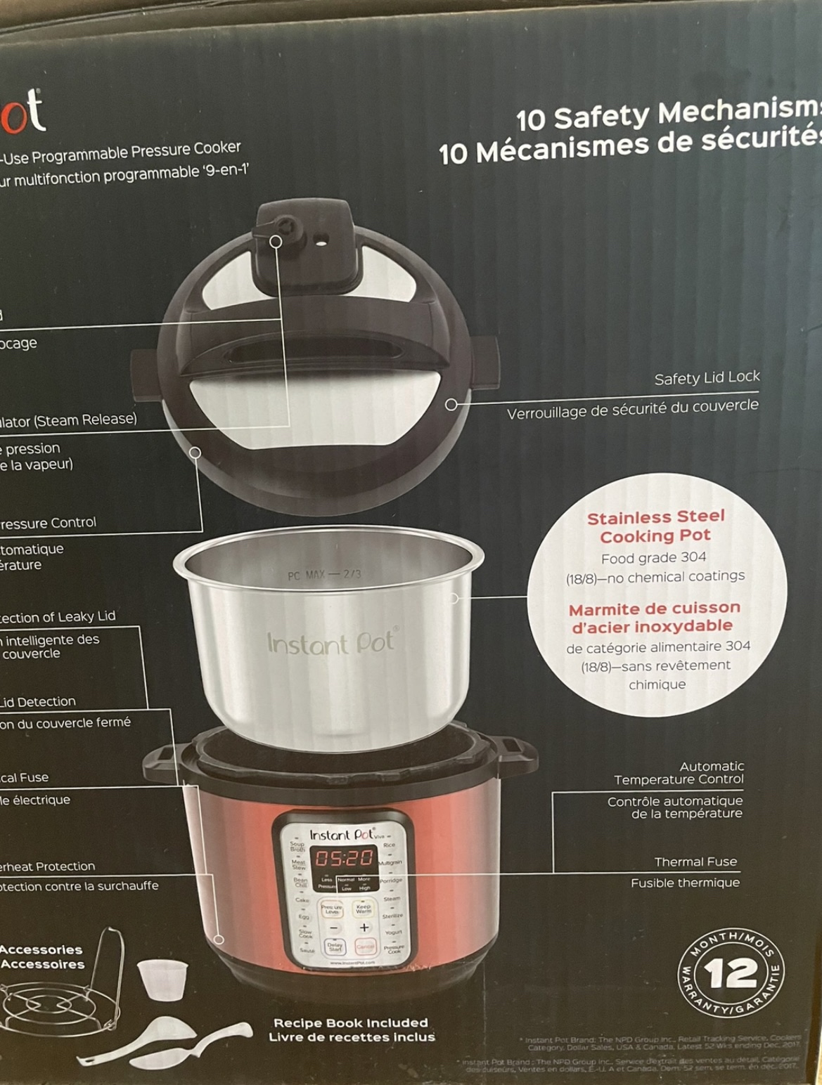 Price drop! Still in box, brand new Viva Instant Pot. 9-in-1 Multi-use programmable appliance. It will save you tons of time and energy. Make stews, jams, yogurt, rice, cakes etc. $190-$240 regular price This is the 2nd highest model; and in a gorgeous metallic red colour to stand out in your kitchen. It’s in the most popular and useful 6 quart size. I’m selling because I bought 2 and didn’t return in time.