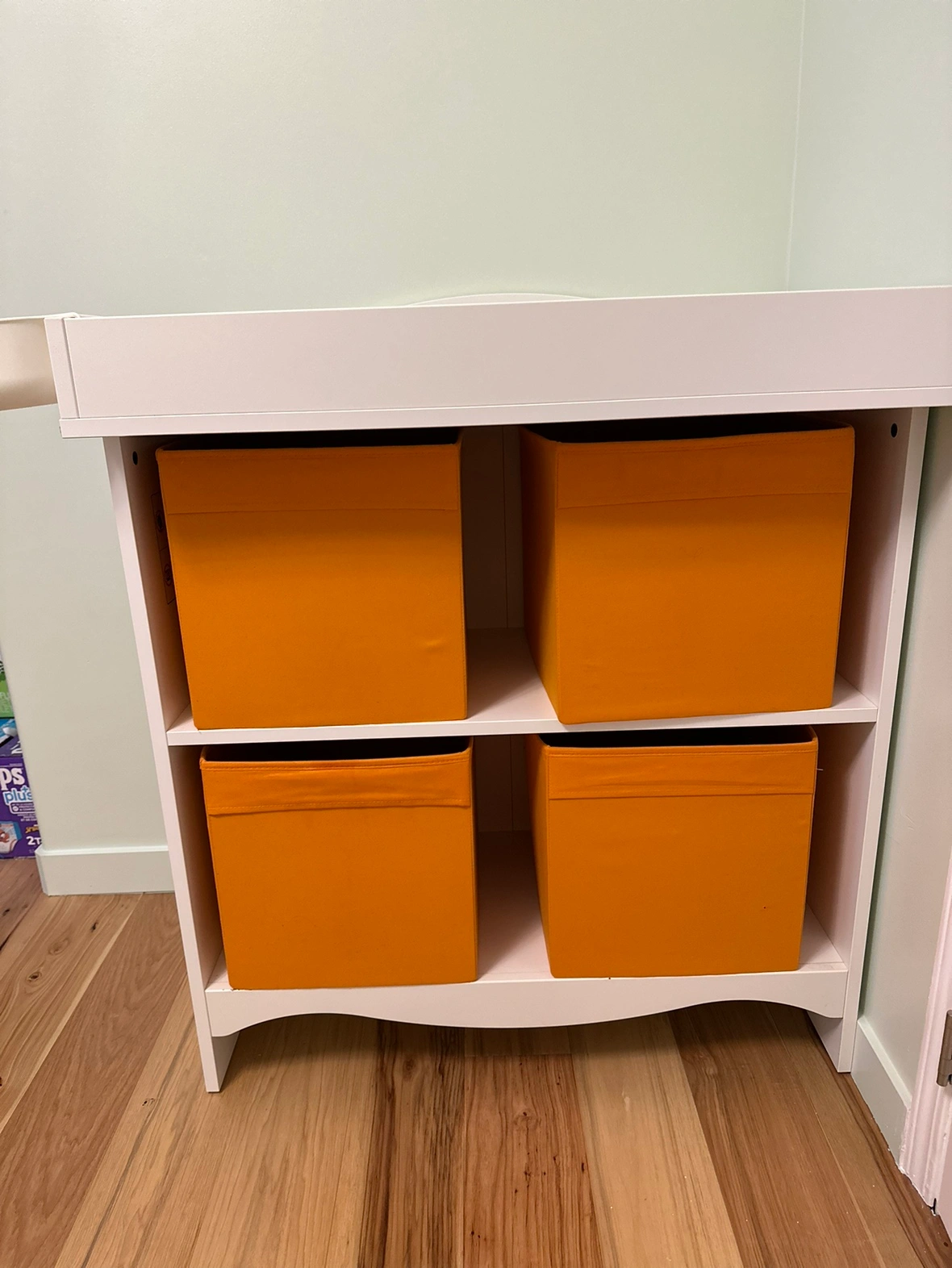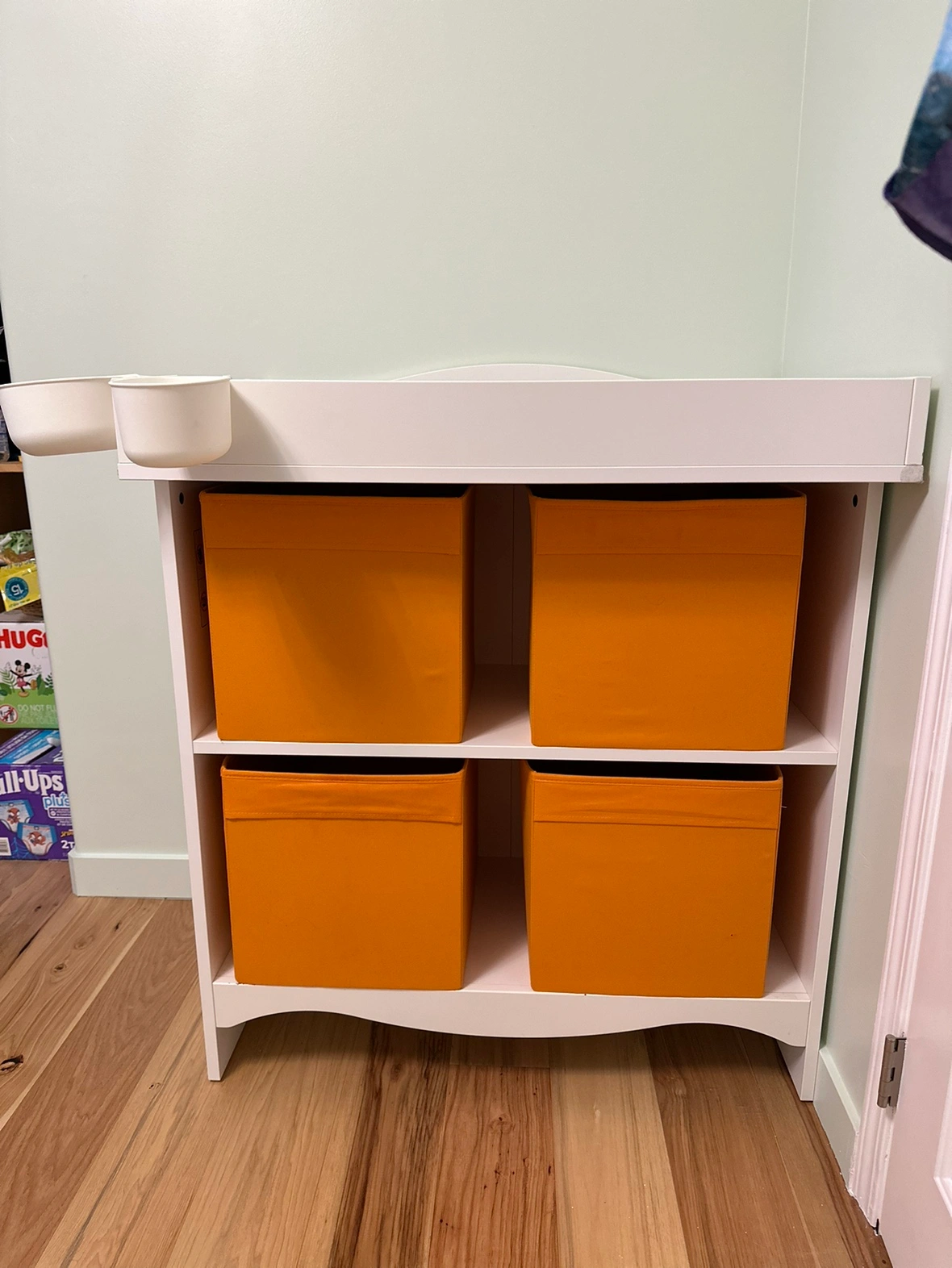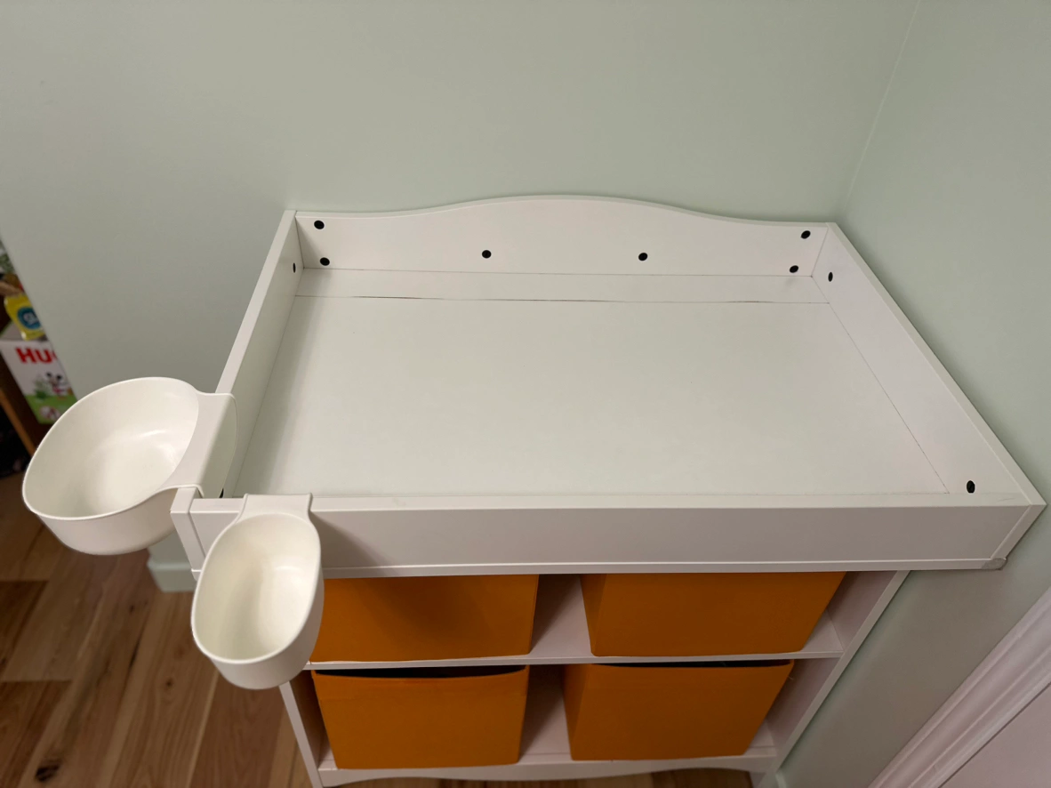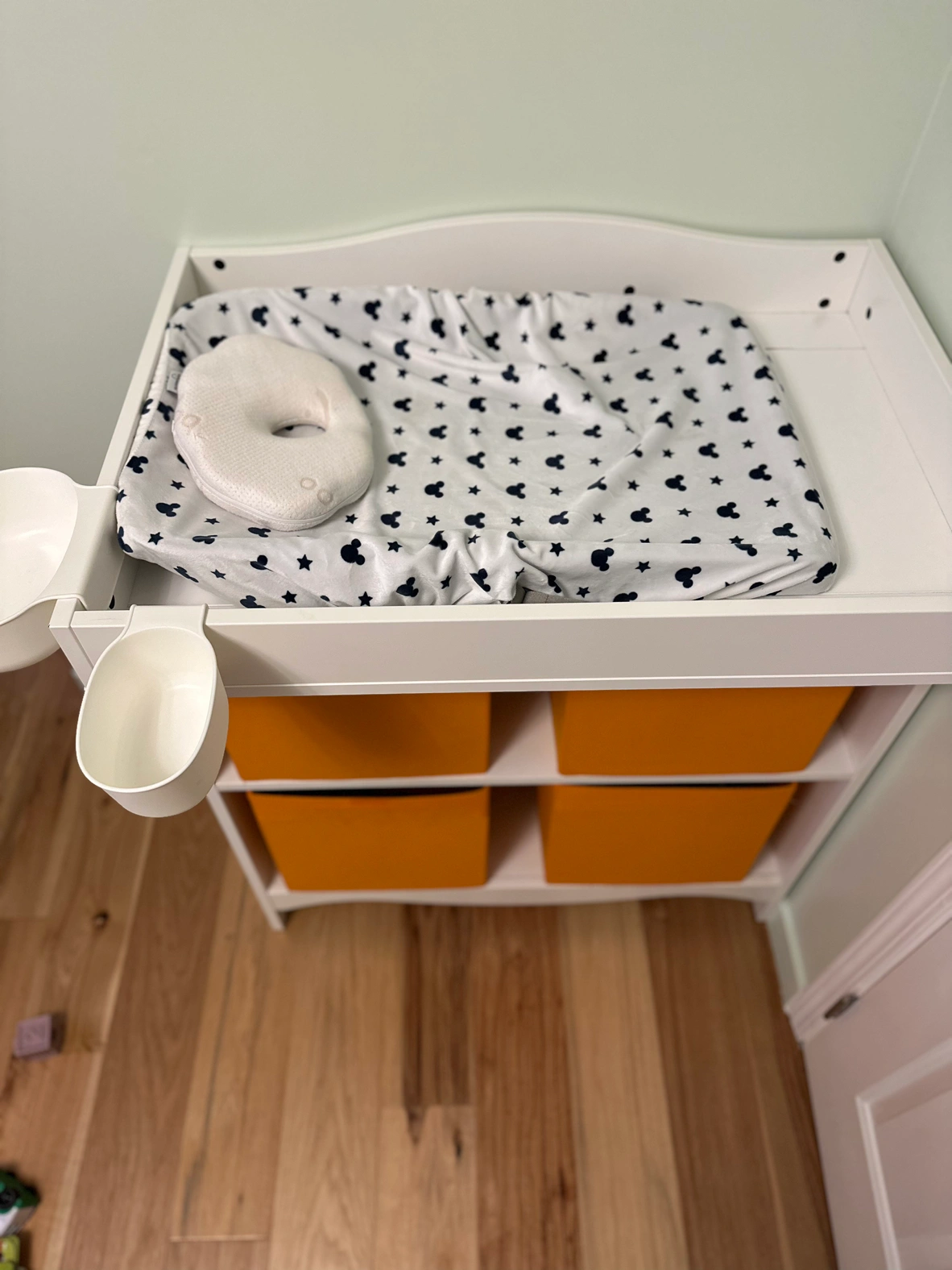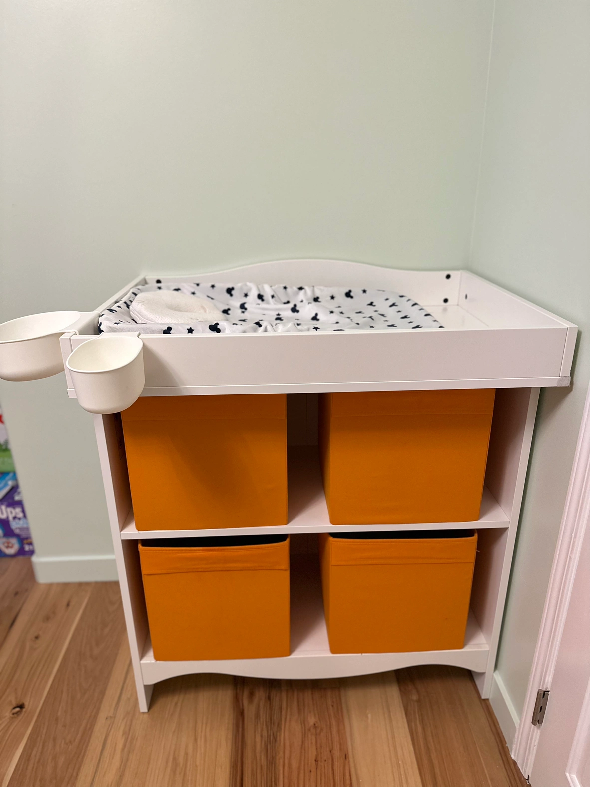 • 2 storage cups that clip onto side (can use for diapers, wipes, cloths, lotion)