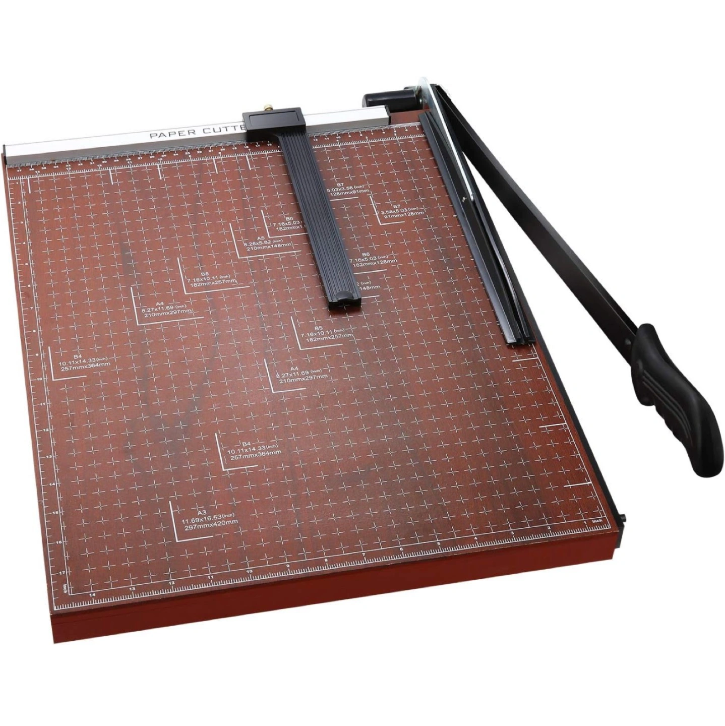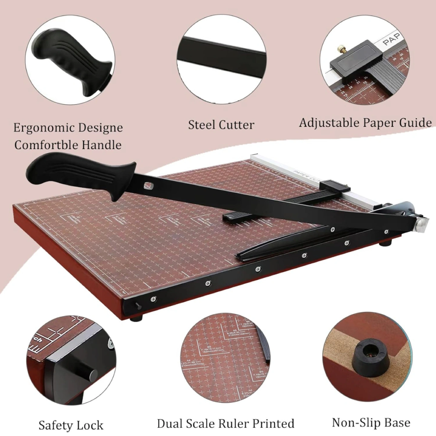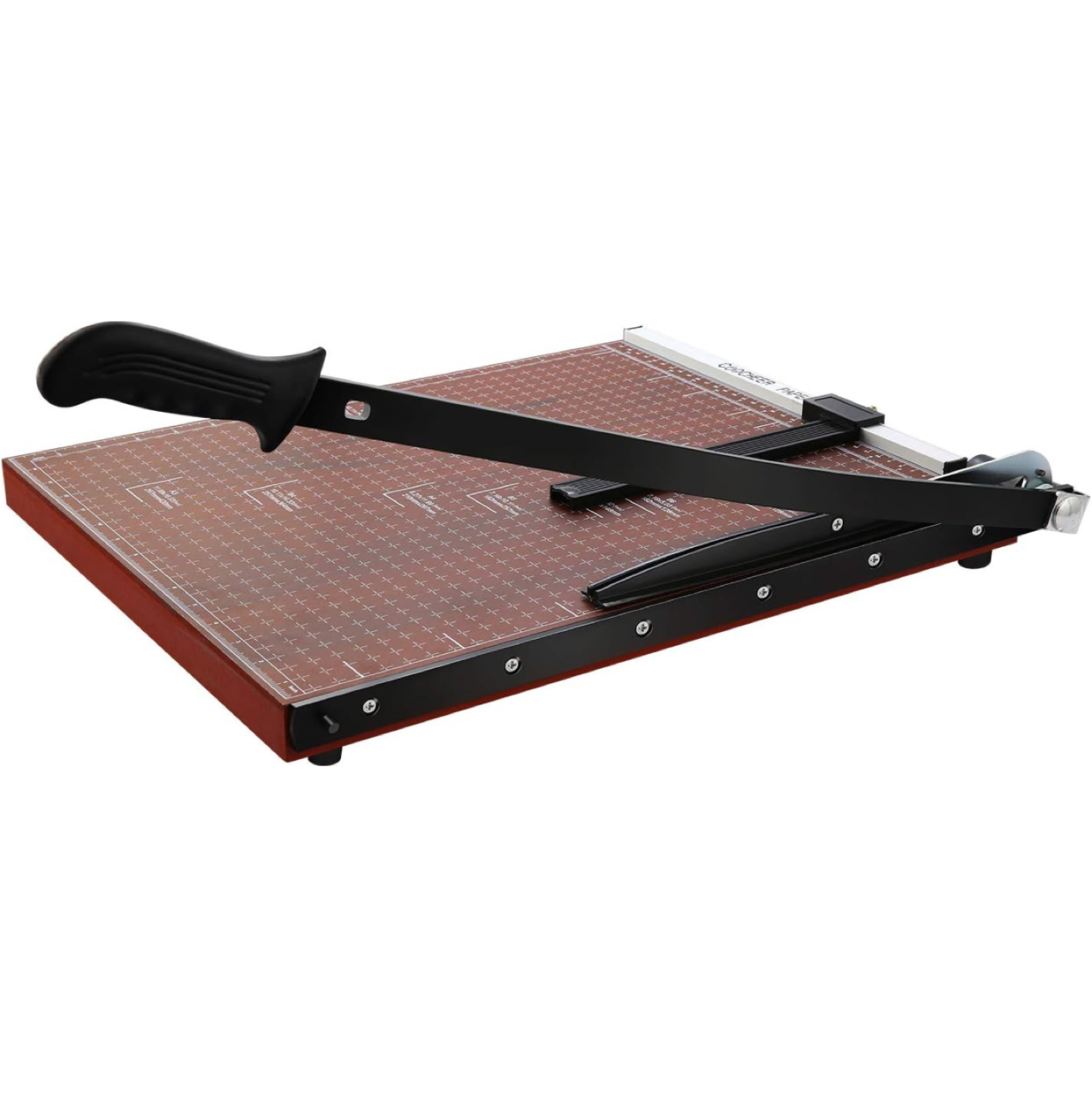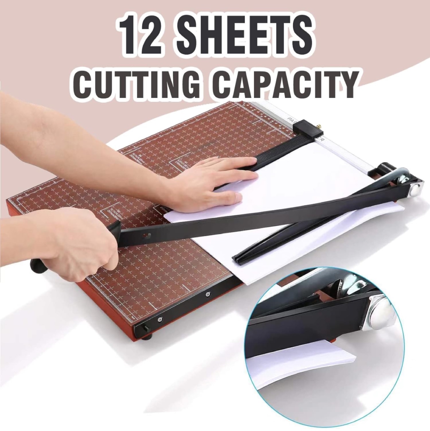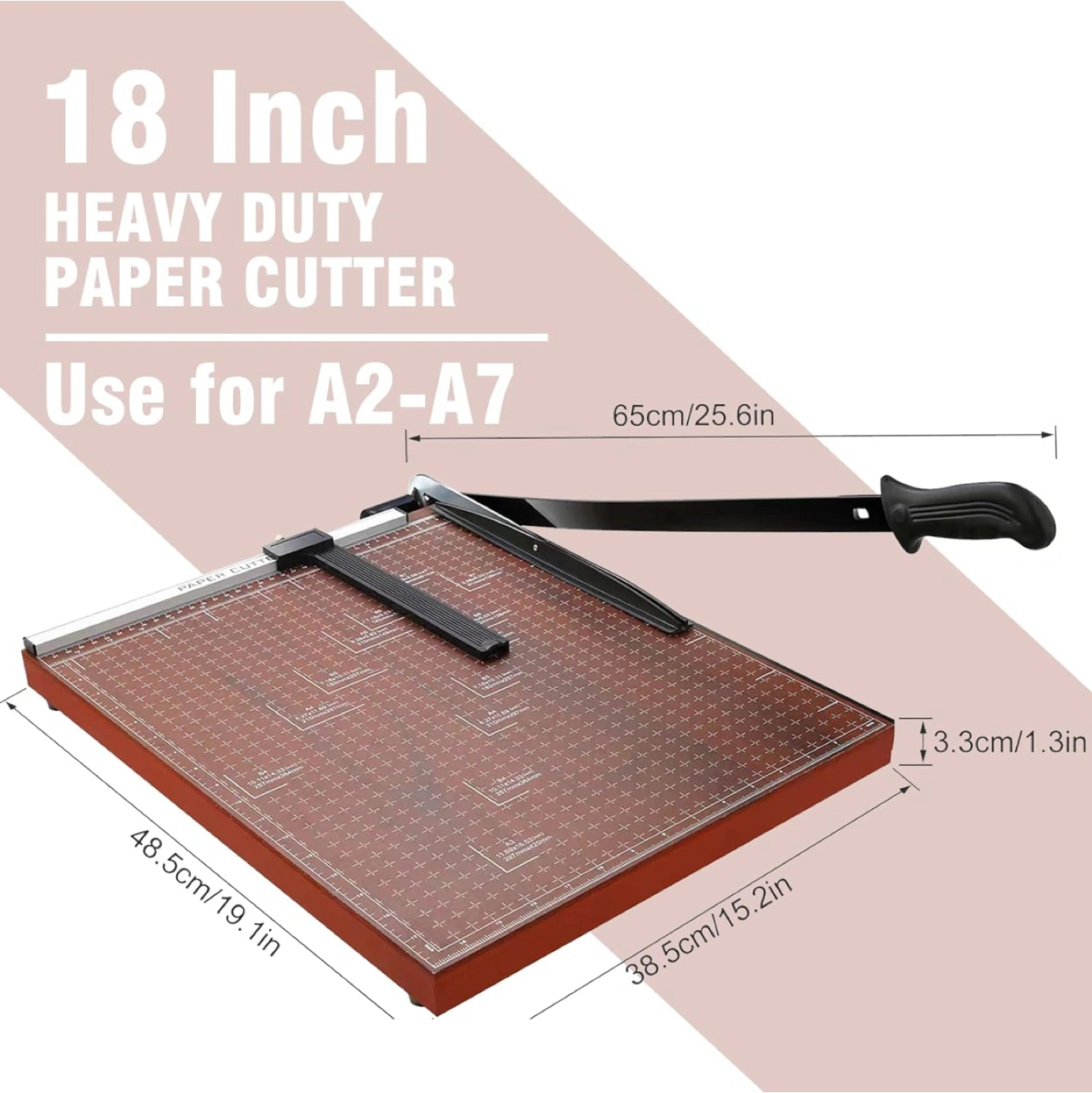 70Accurate Cutting: Precision-designed paper guillotine with multiple alignment grids and millimeters/inches printing for accurate measuring. -Movable magnetic positioning block ensures straight alignment. -Convenient & Efficient: Dual-direction size scale marks for easy paper cutting. -Large 18.9" x 15.0" guillotine with 18-inch cut length slices through up to 12 sheets at once. -Safety Design: Latch hook secures trimmer arm, fully hiding the blade to prevent accidents. -High Quality: Crafted from high-quality steel for durability. Sturdy yet lightweight design for easy handling. -Wide Application: Versatile heavy-duty cutter for papers, photos, labels, cardstock, and more. -Ideal for offices, schools, homes, printing shops, photo studios, ensuring safe use even around kids.