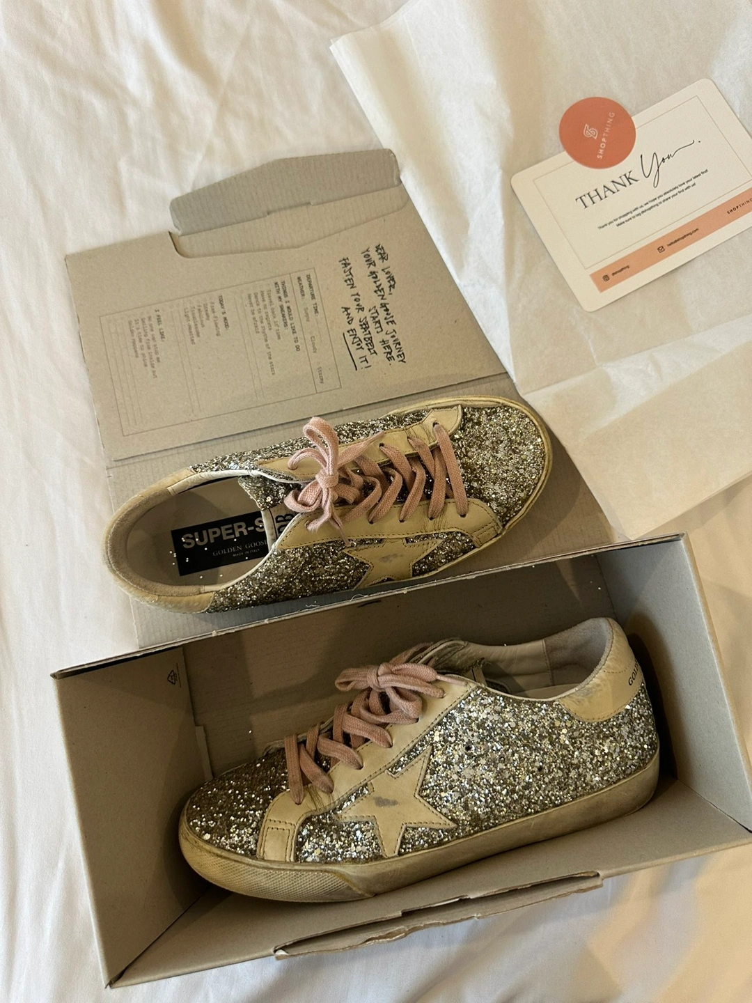 size 38 - brand new never worn authentic sneakers in sparkly superstars with beautiful pink straps. Retails for +$800