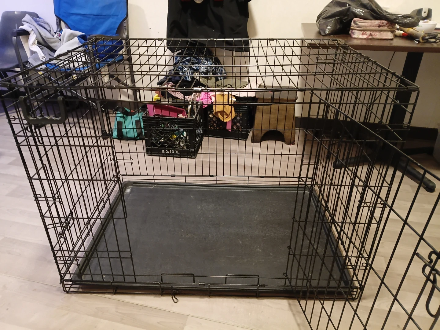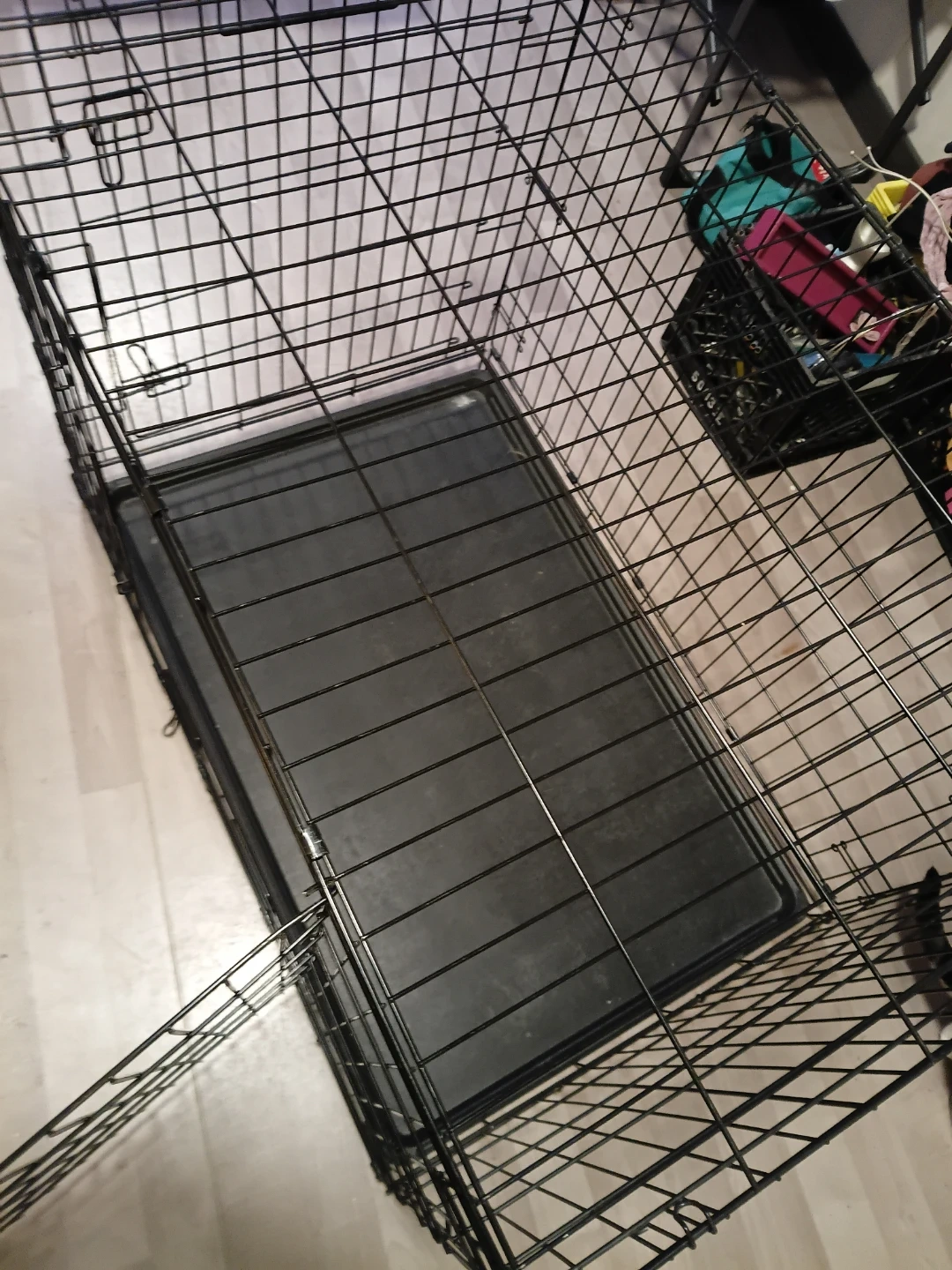 This is a sturdy wire dog crate, perfect for training or travel. It comes with a durable plastic tray for easy cleaning. Folds flat for storage. For med-large size dogs. 40 OPEN TO OFFERS