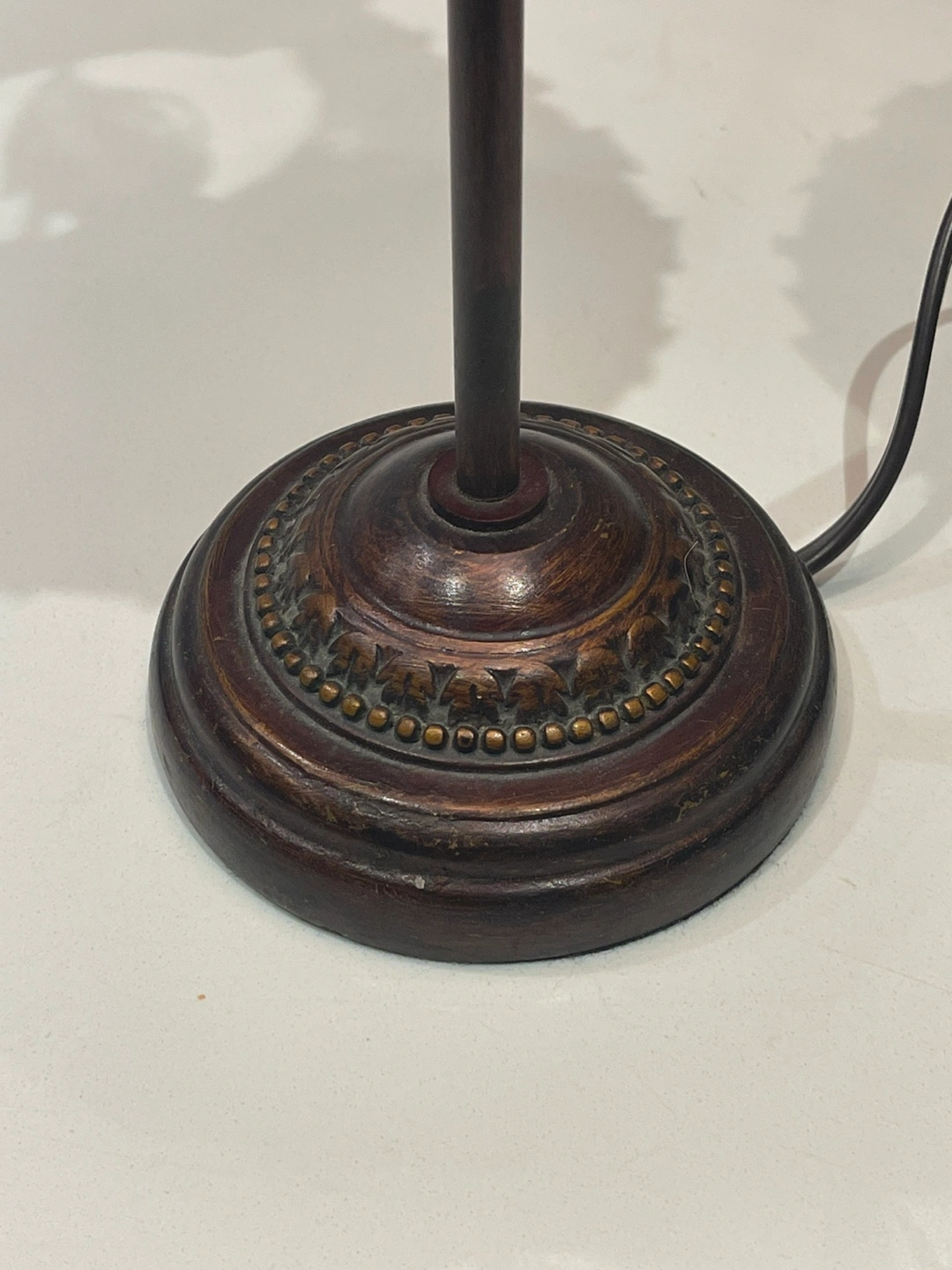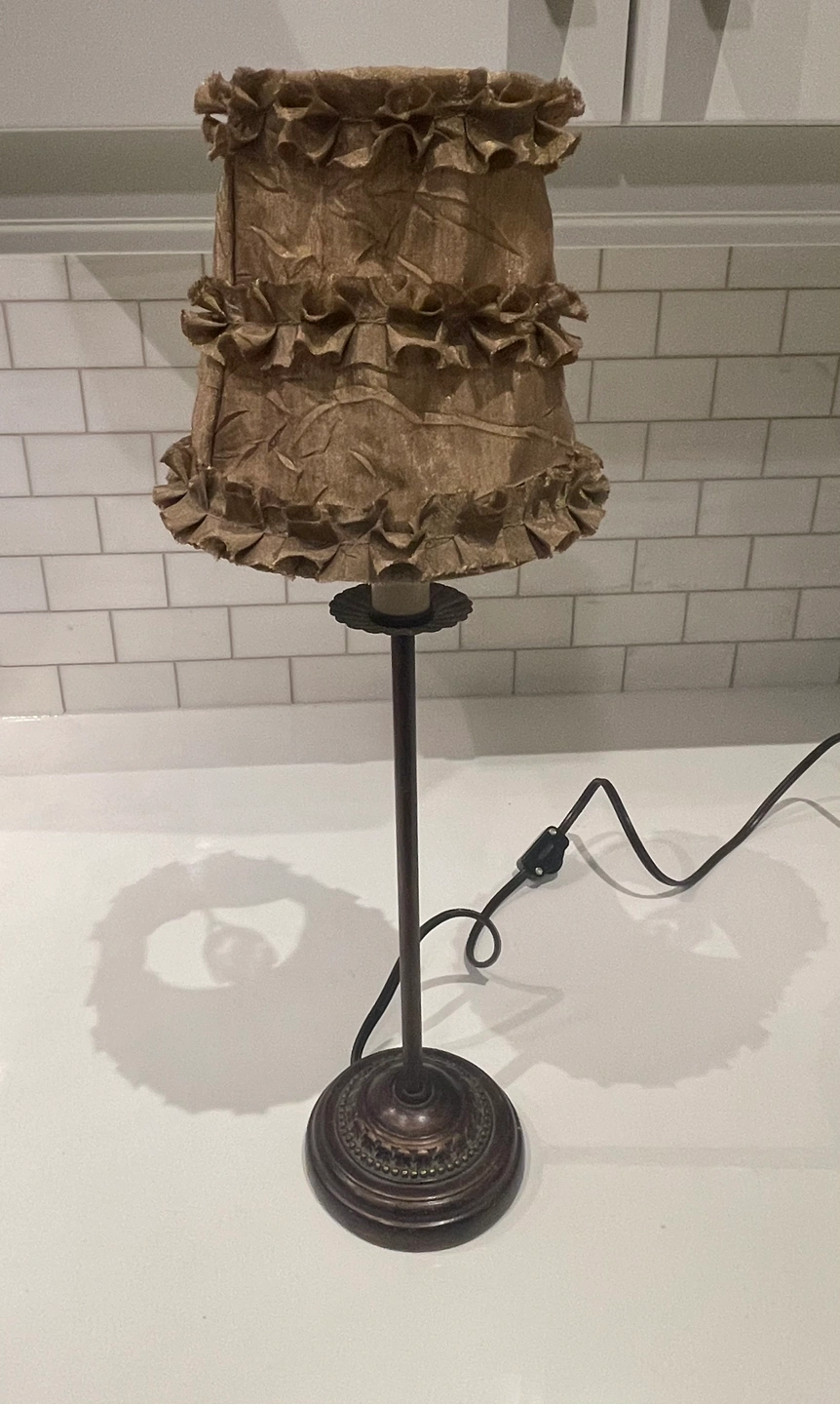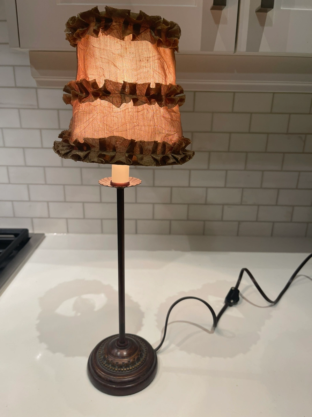 Small but tall utility table lamp , 18 inches tall base is 4 1/2 inches wide . The lamp is in working order if your handy you can easily change the material on the shade to suit your decor, includes the light bulb.