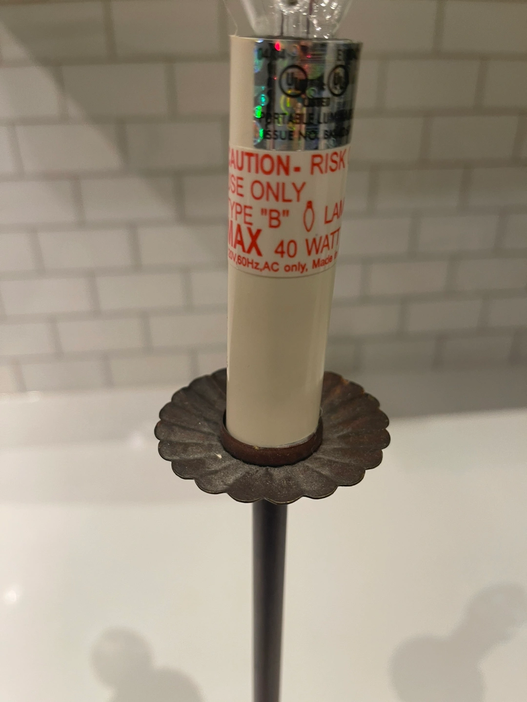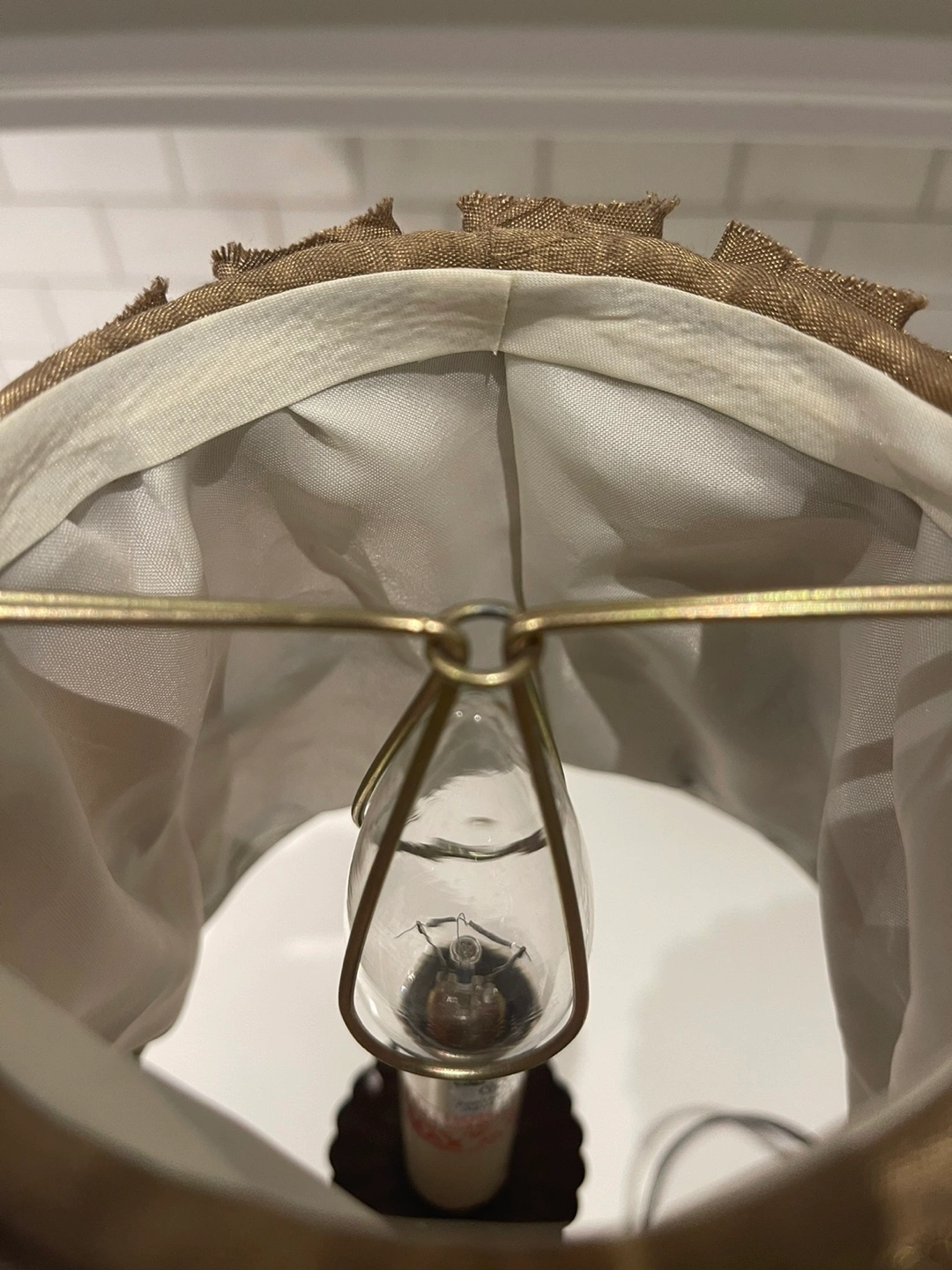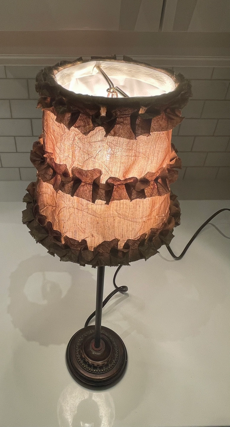 Small but tall utility table lamp , 18 inches tall base is 4 1/2 inches wide . The lamp is in working order if your handy you can easily change the material on the shade to suit your decor, includes the light bulb.