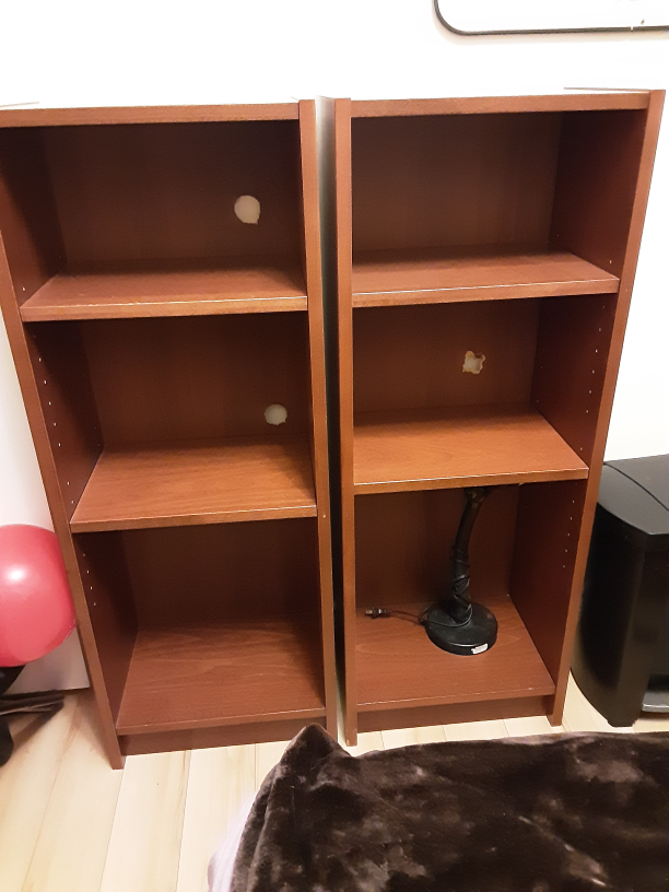 adjustable shelves, holes to send a plug thru or use as bookshelf