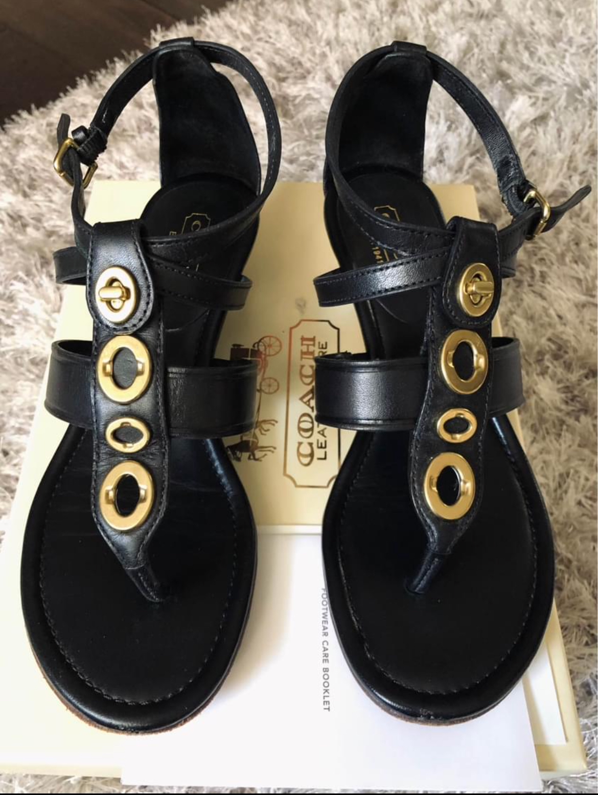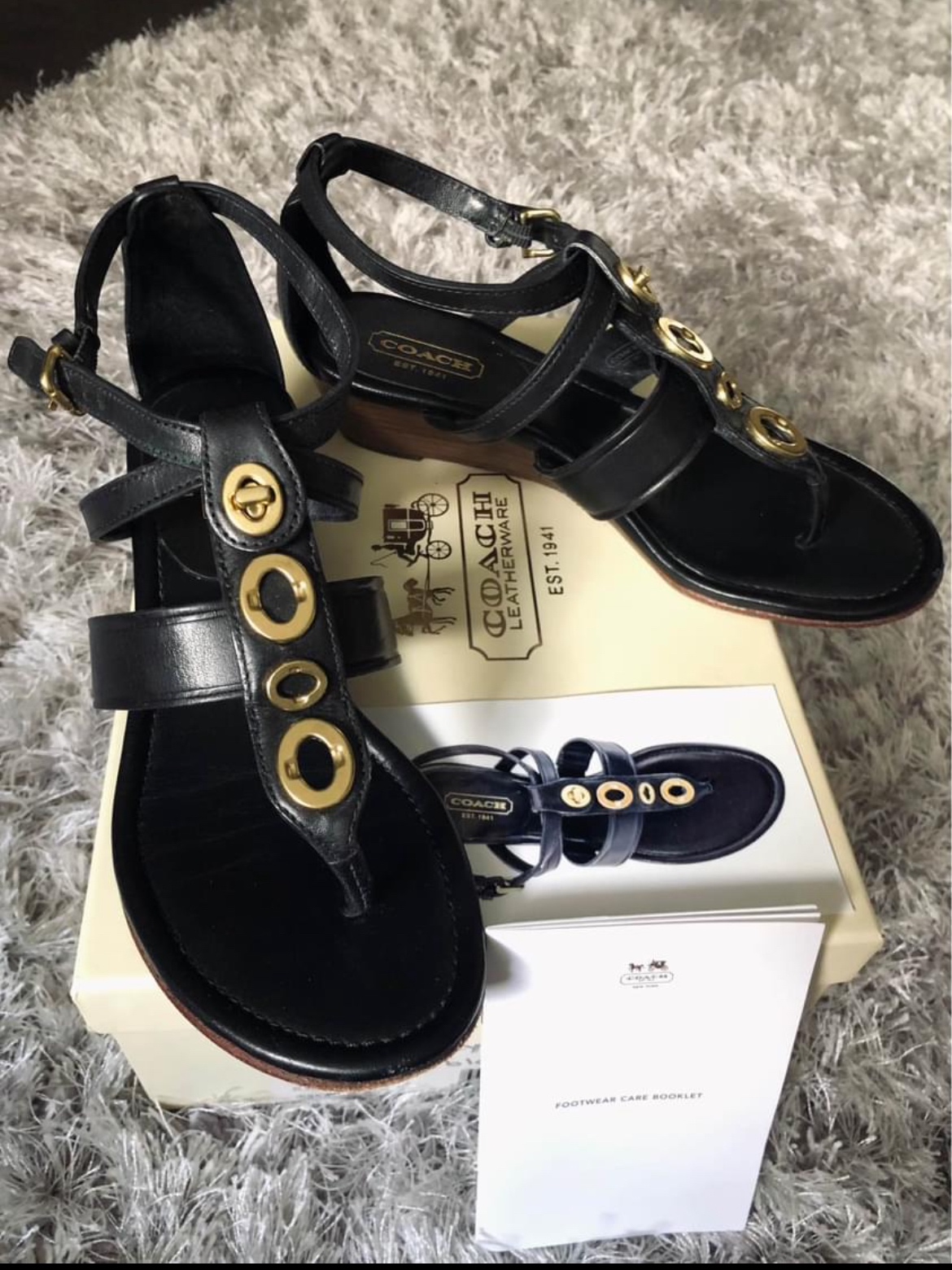 125Gorgeous black leather Gladiator sandals. Incredible condition! Beautiful matte-gold hardware. Soft leather. Come in original box. Size 5 in Coach brand.. could fit a 5.5 as well. I can only meet you in Markham. location Petro Canada corner of 16 ave and 9th line Or Shoppers drug mart of Hwy7/Wooten way