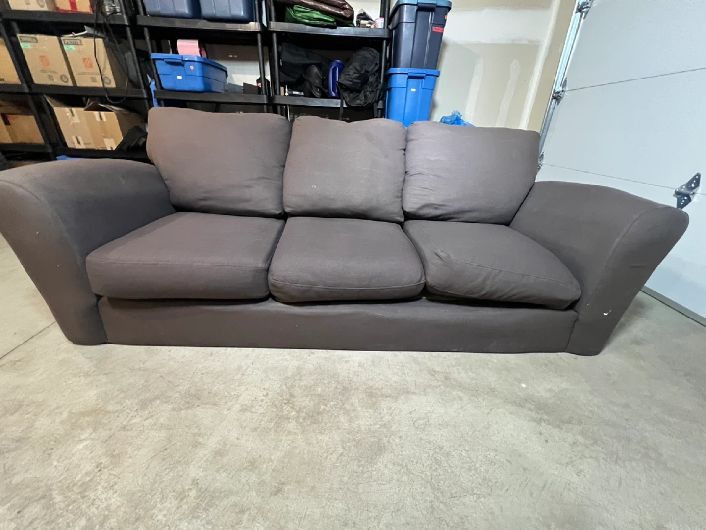 This is a comfortable brown three-seater sofa. It's upholstered in a soft fabric and has plush cushions. It would make a great addition to any living room!