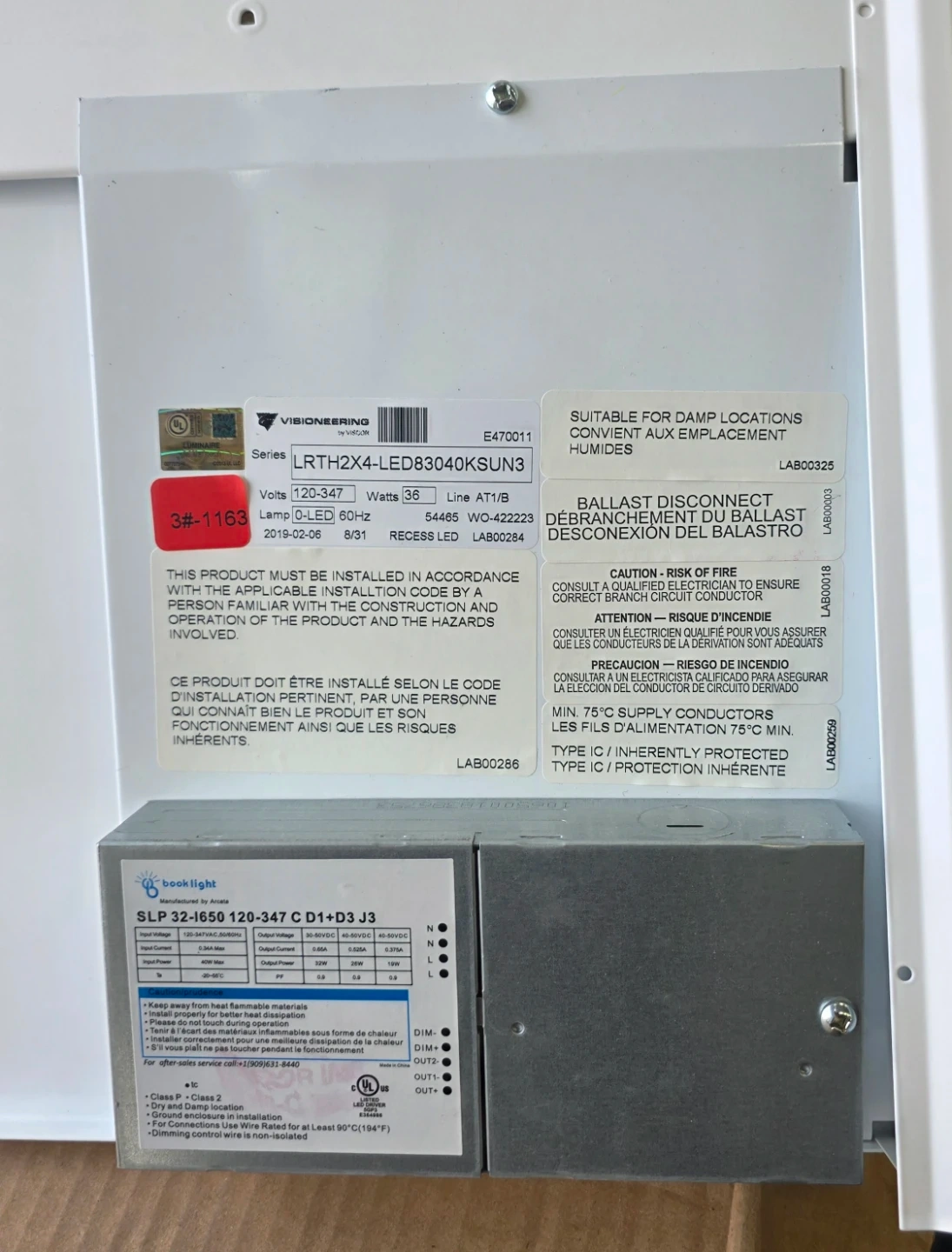 Selling several brand new Visioneering LED 2x4 lights, model LRTH2X4-LED83040KSUN3. It operates on 120-347 volts and is suitable for damp locations. The item number is 54465. Comes in its original boxes!