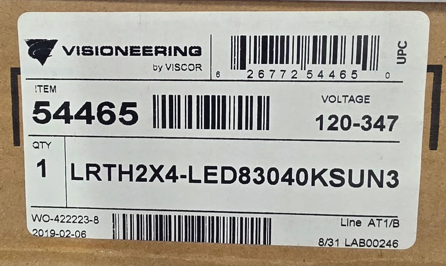 Selling several brand new Visioneering LED 2x4 lights, model LRTH2X4-LED83040KSUN3. It operates on 120-347 volts and is suitable for damp locations. The item number is 54465. Comes in its original boxes!