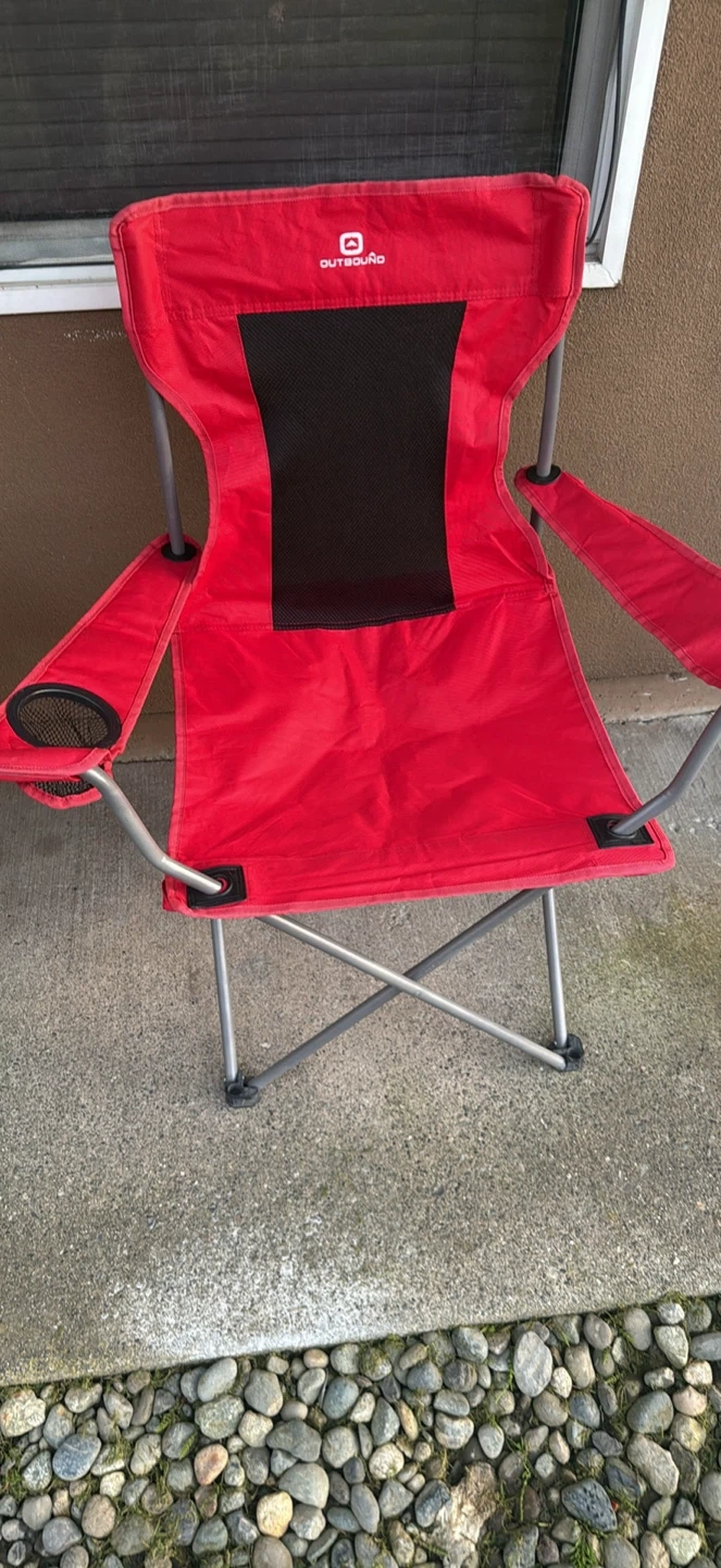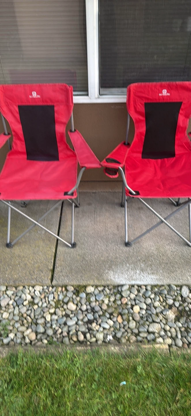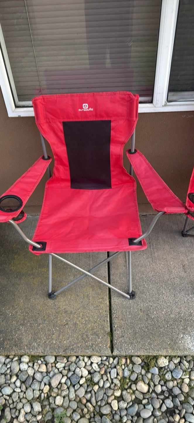 Two red Outbound folding camp chairs. They feature mesh backs and built-in cup holders. Great for camping trips or backyard gatherings! $25 for both