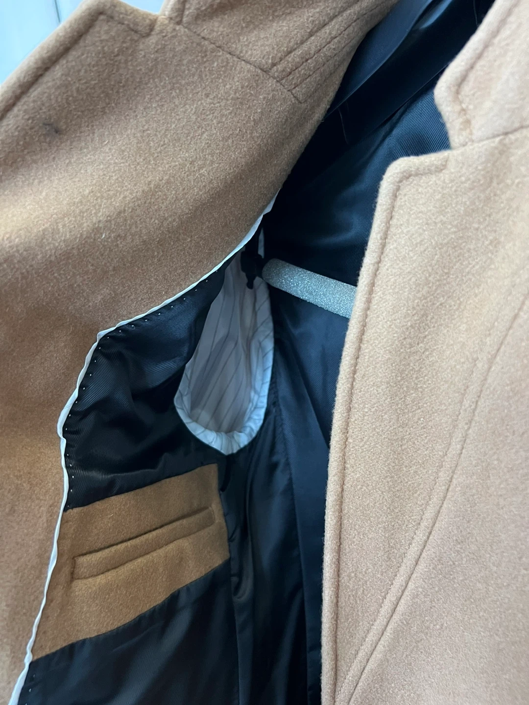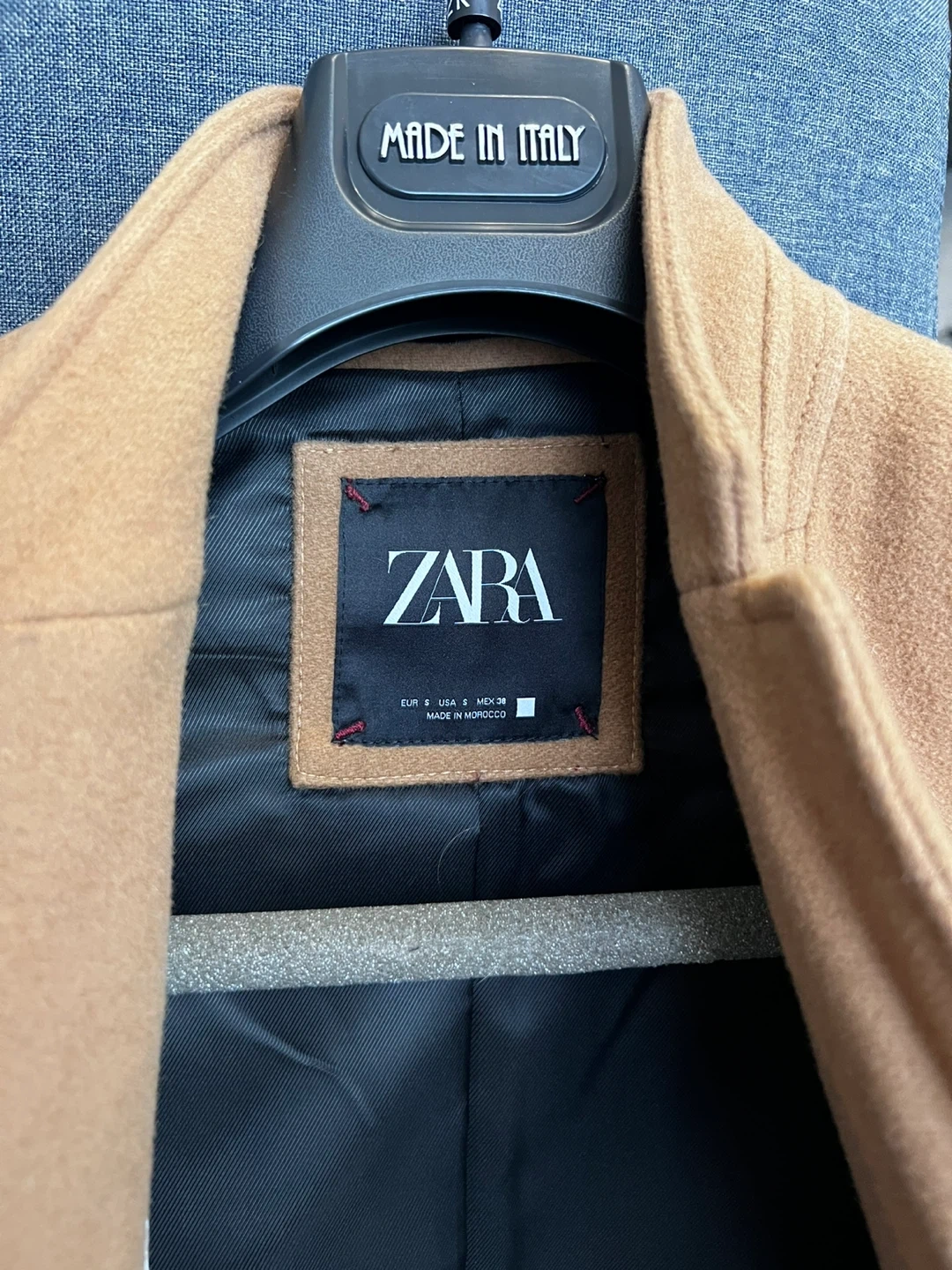 Stylish camel-coloured wool blend coat from Zara. It features a modern collar and button closure. Made in Morocco.