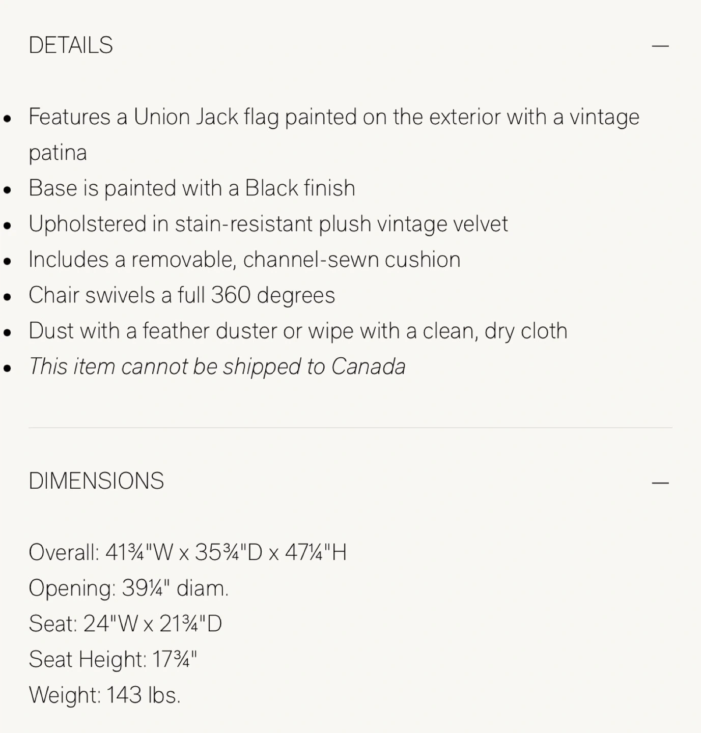Originally retailed for ~$4,000 USD, asking $2800 CAD OBO. This chair is a true statement piece that blends luxury craftsmanship with bold British flag styling.