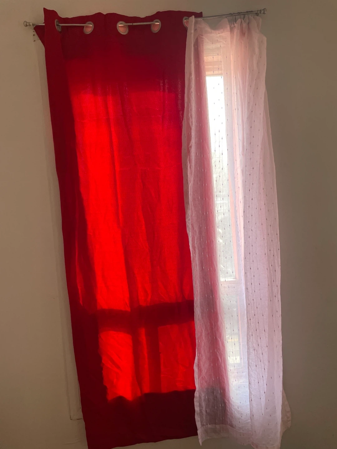 I have a set of 4 Mainstays curtain panels for sale! There are 2 red panels, 2 off-pink panels. The red panels measures 40 inches x 84 inches, the pink panels measures 51 inches x 63 inches and one of them has curtain handles pierced into it(see pictures).