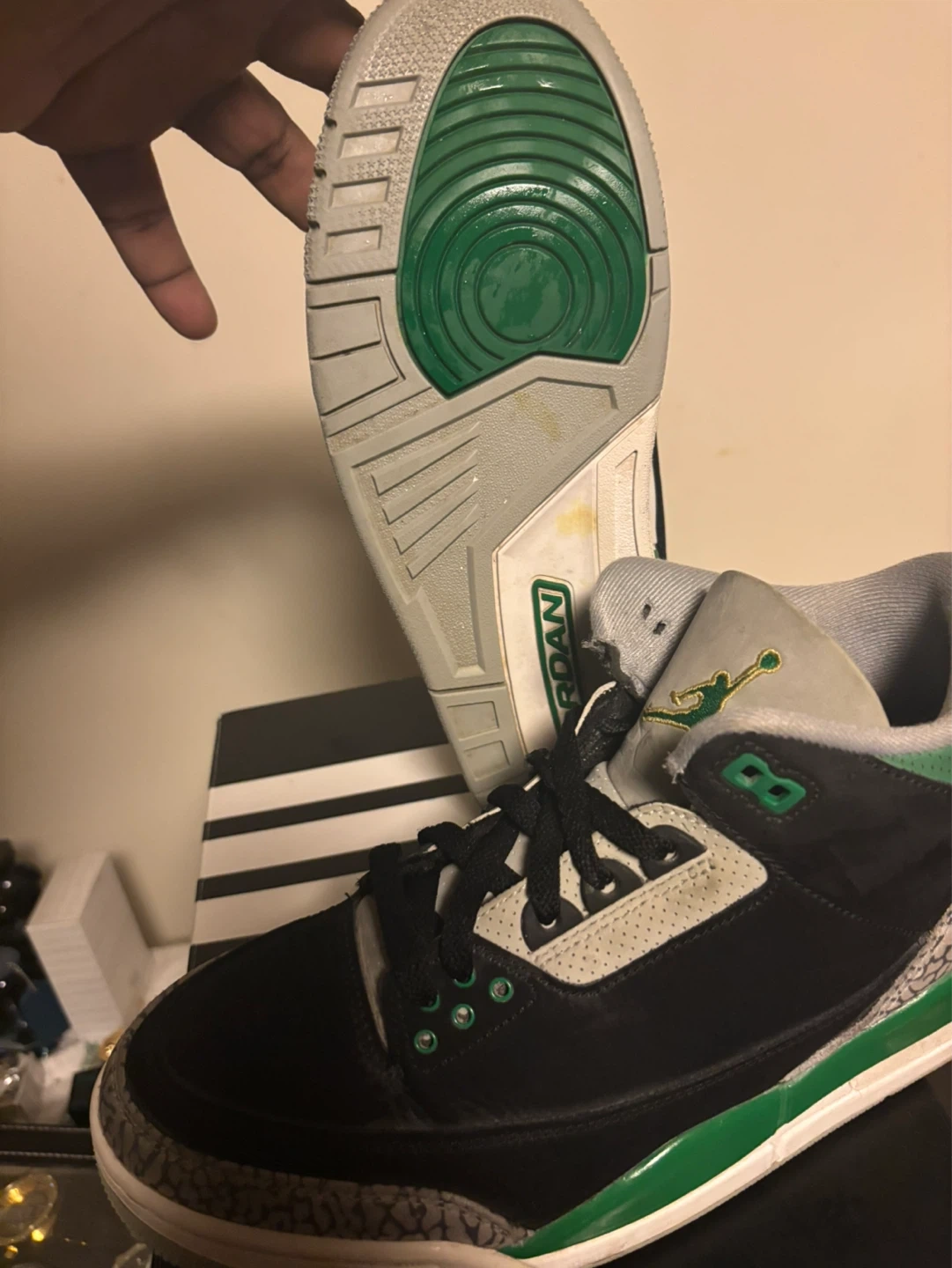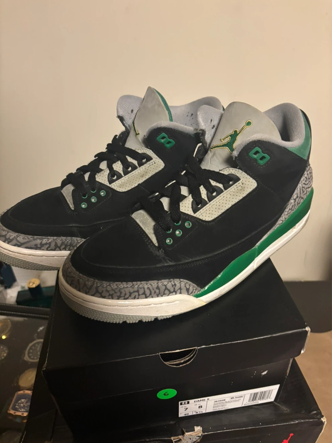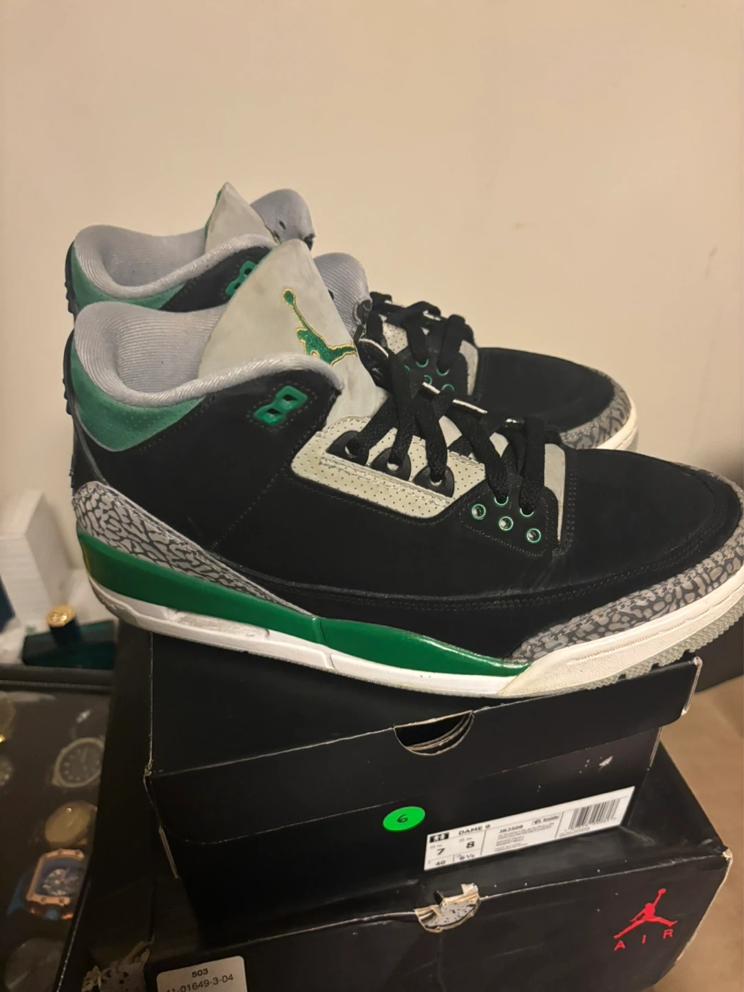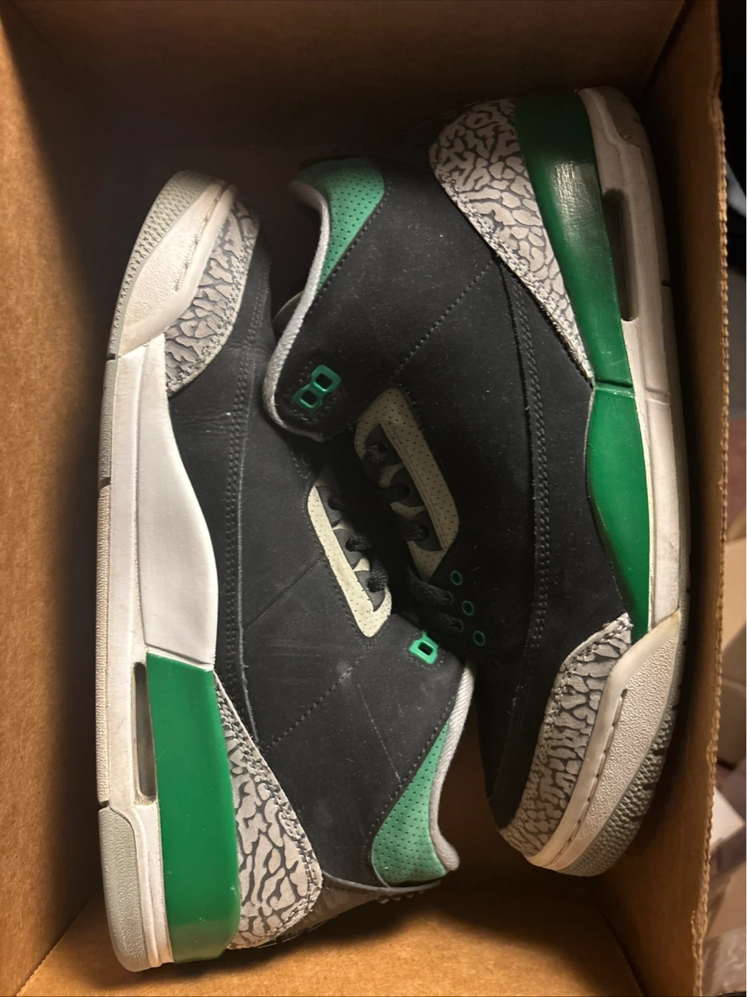 Air Jordan 3 Retro sneakers in Pine Green colorway. Suede and leather upper with elephant print overlays. Includes original box.
