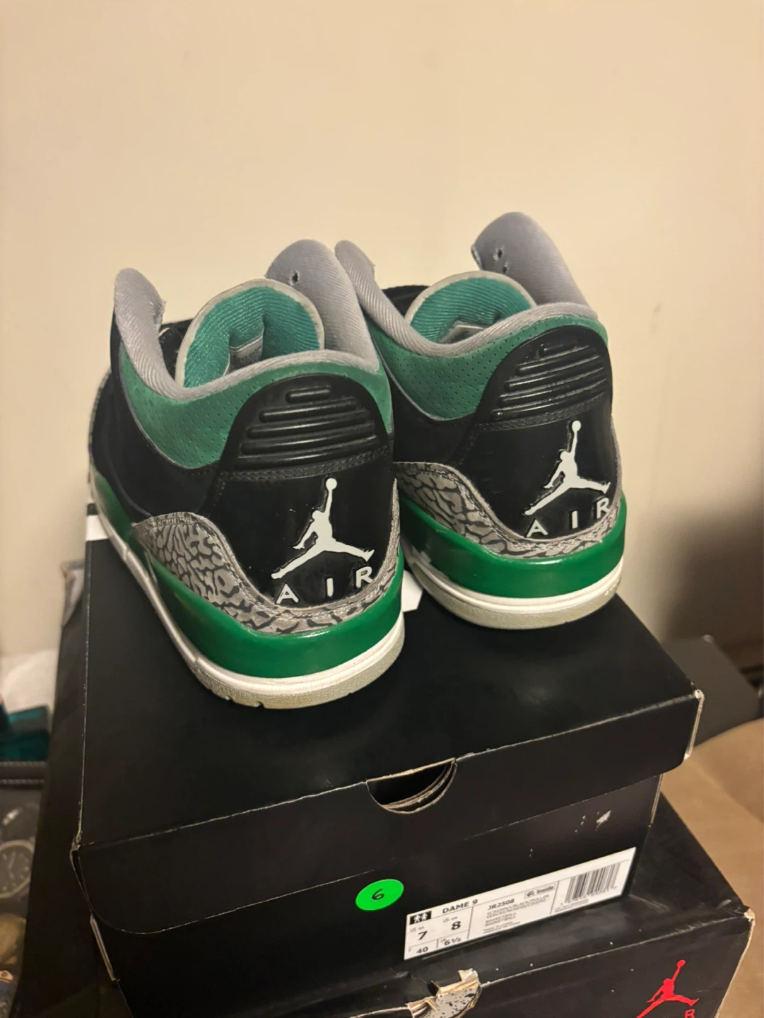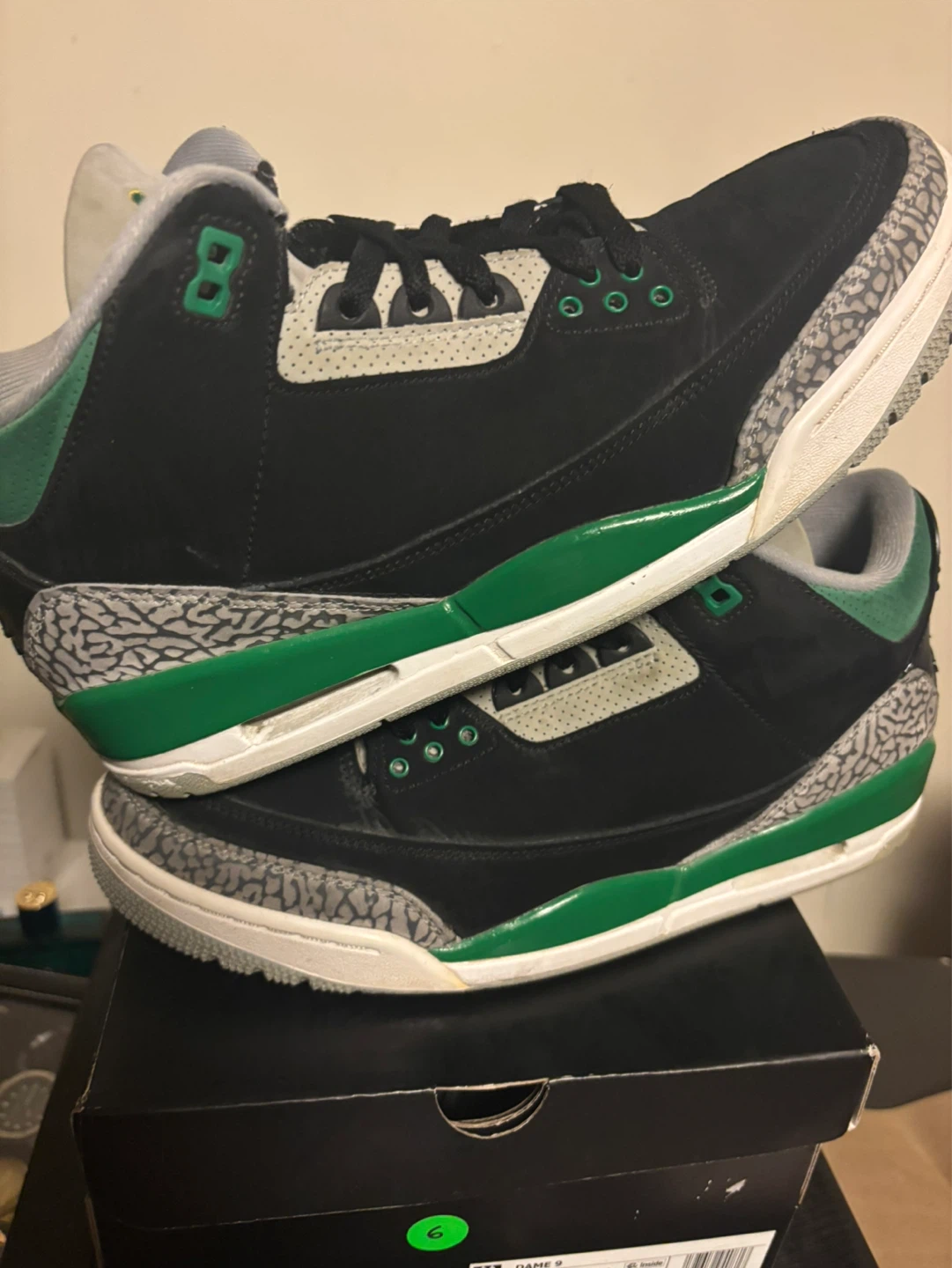 Air Jordan 3 Retro sneakers in Pine Green colorway. Suede and leather upper with elephant print overlays. Includes original box.