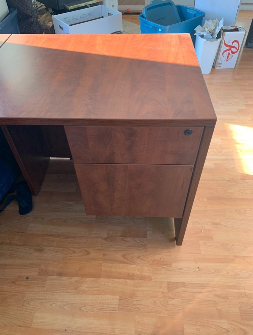 Large corner desk with hutch and one drawer. The desk measures 66" wide, 29" deep, and 23.5" high. The hutch measures 66" wide, 36" deep, and 29" high.
