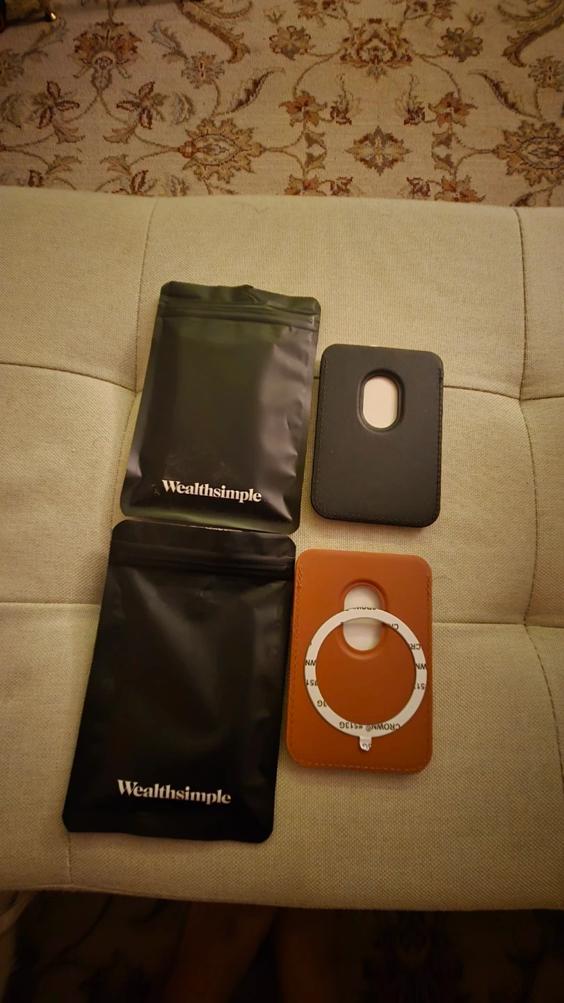 Two Wealthsimple card wallets. One black and one tan. Both made from faux leather. Includes two black Wealthsimple pouches.