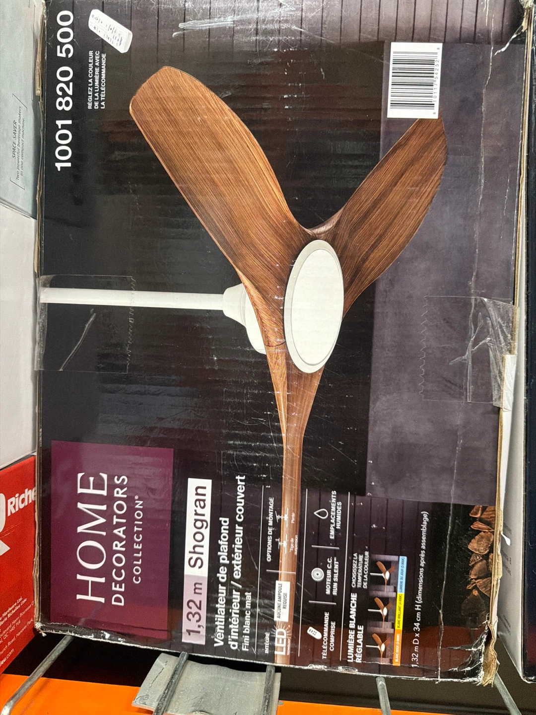 This is a 1.32m Shogran ceiling fan from Home Decorators Collection. It has a matte white finish and is suitable for damp locations. It comes with a remote control and an integrated LED light with adjustable colour temperature. Dimensions are 1.32m D x 34cm H.