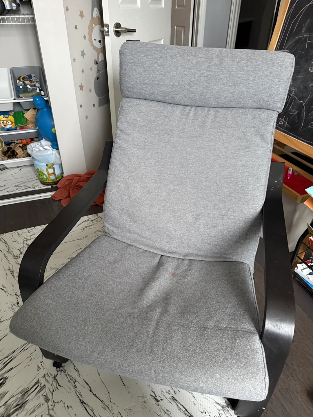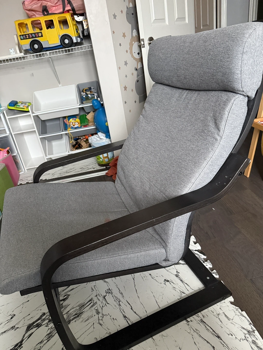 Comfortable grey glider chair with a supportive headrest. It's made with a sturdy dark wood frame and soft fabric cushions. This chair offers a relaxing spot for feeding or lounging.