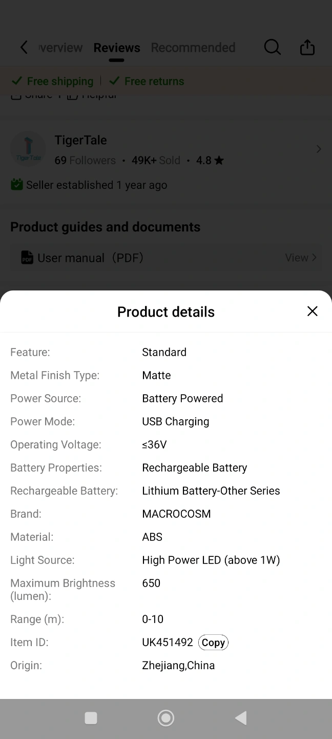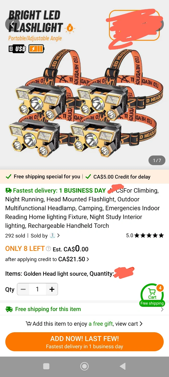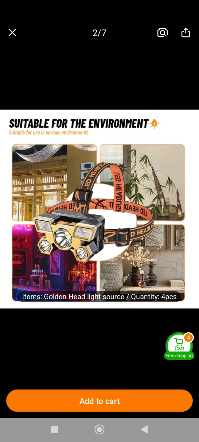 Portable headlamp with adjustable angle. Four light modes. USB rechargeable. Lightweight design, suitable for various environments. Includes headband and charging cable. Golden colour.