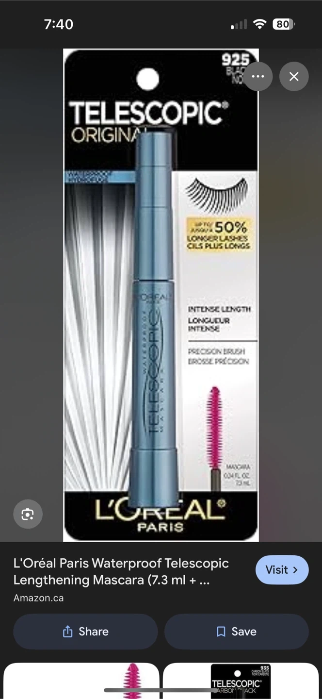 L'Oréal Paris Telescopic Mascara Hydrofuge. It's a water-resistant formula. This mascara helps to lengthen lashes for a dramatic look.