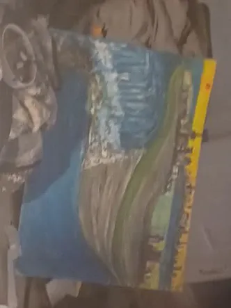 Original abstract painting depicting a landscape scene with blue water and earthy tones. It's a unique piece with vibrant colours and textured brushstrokes. Adds a pop of colour to any room!