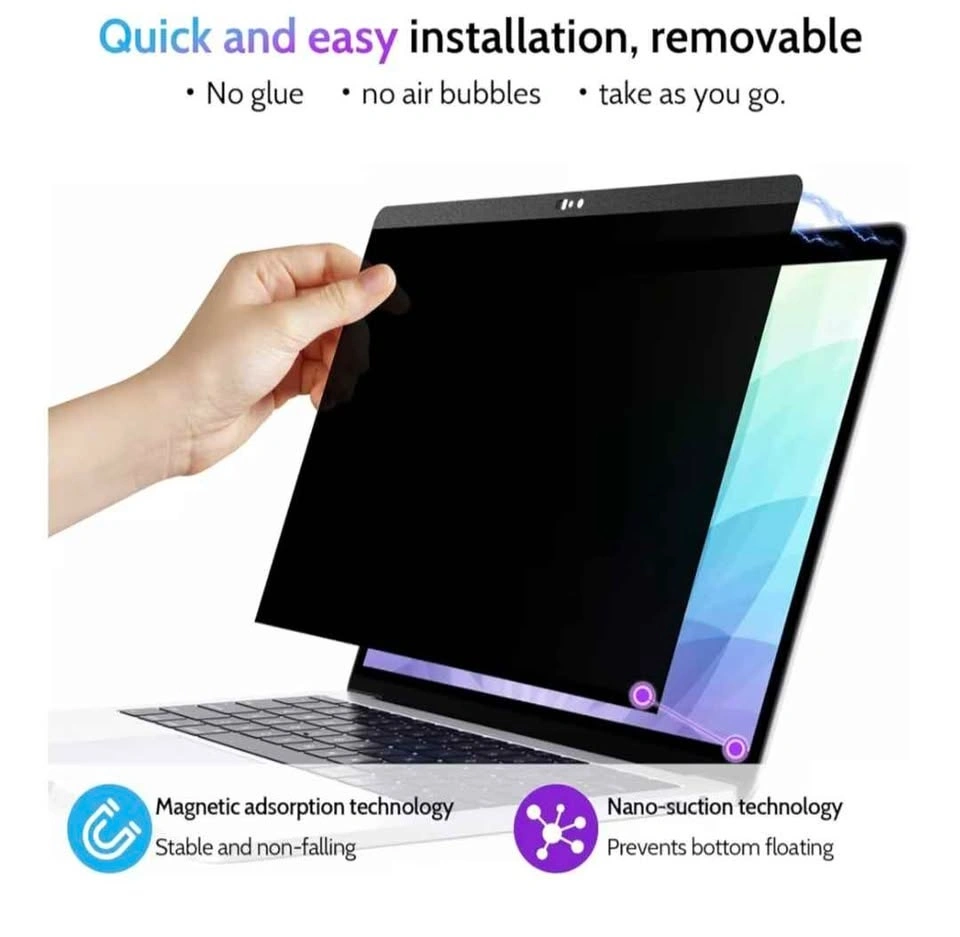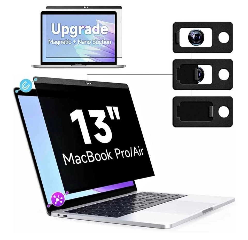 Magnetic privacy screen for MacBook Air 13 Inch (2018-2021, M1) and MacBook Pro 13 (2016-2022, M1, M2). Anti blue light glare filter, removable black protector with camera cover. Retails for $38 plus tax.