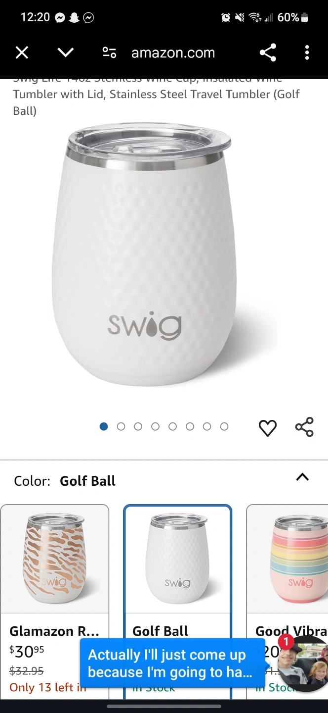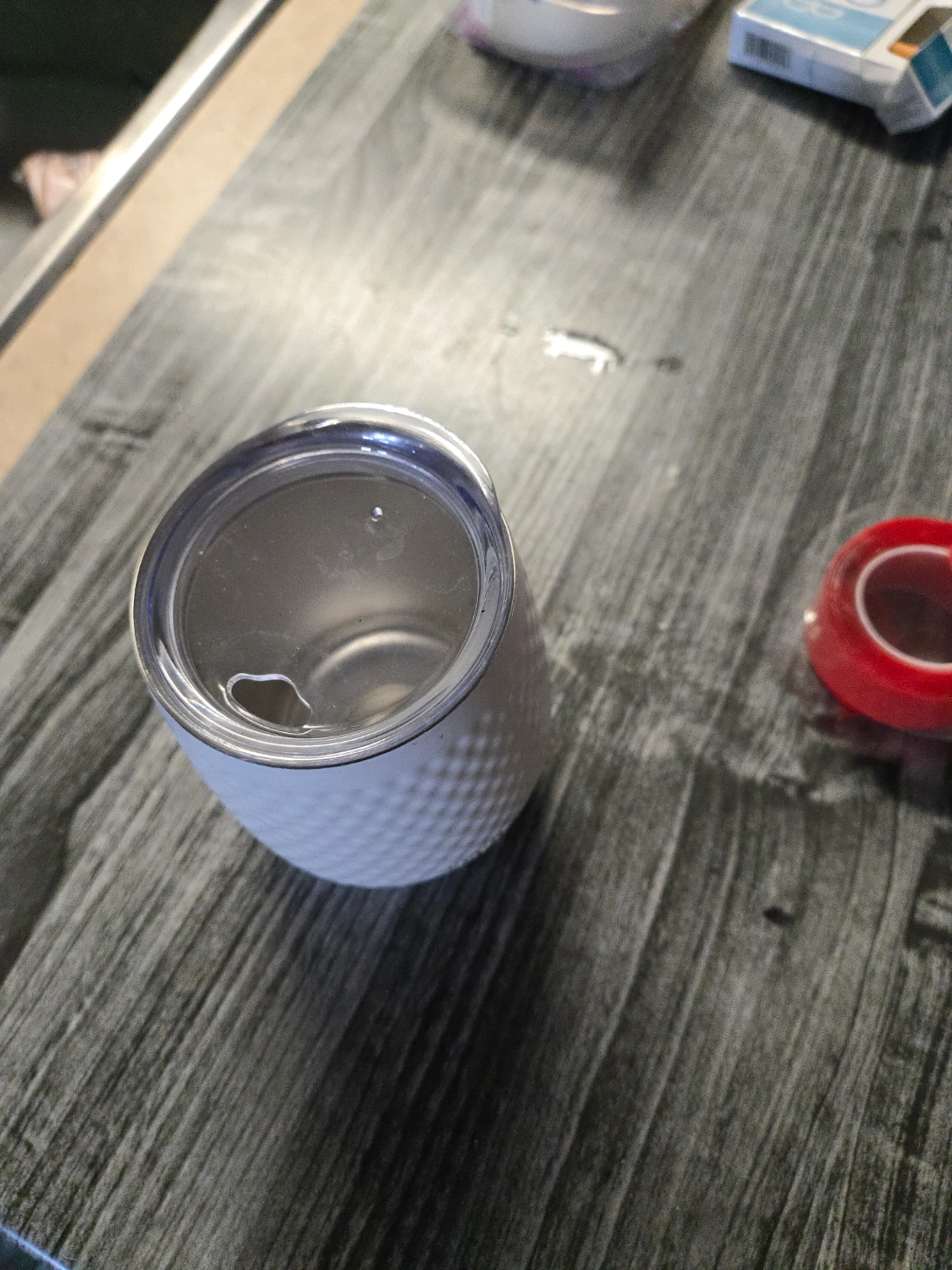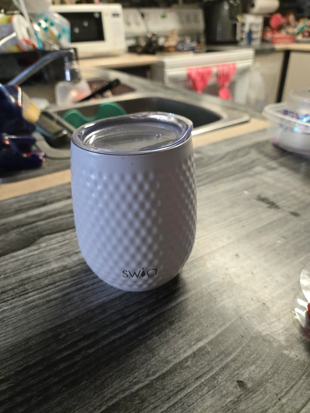 SWIG wine tumbler. Features a golf ball textured design. Includes a clear lid. Stainless steel travel tumbler. pick up only please