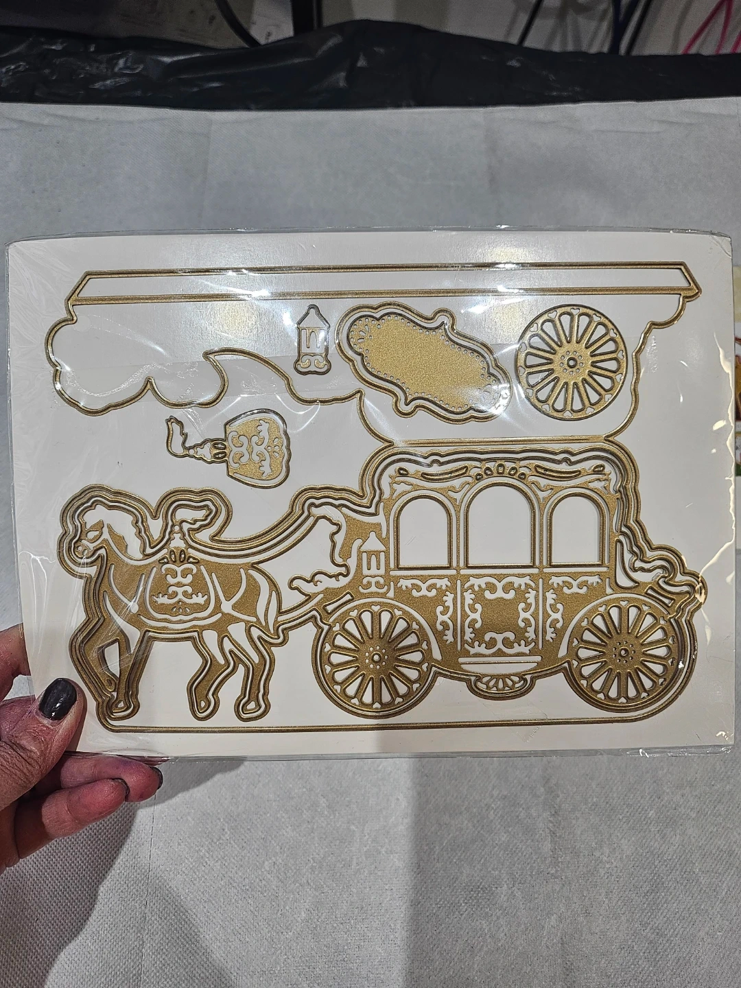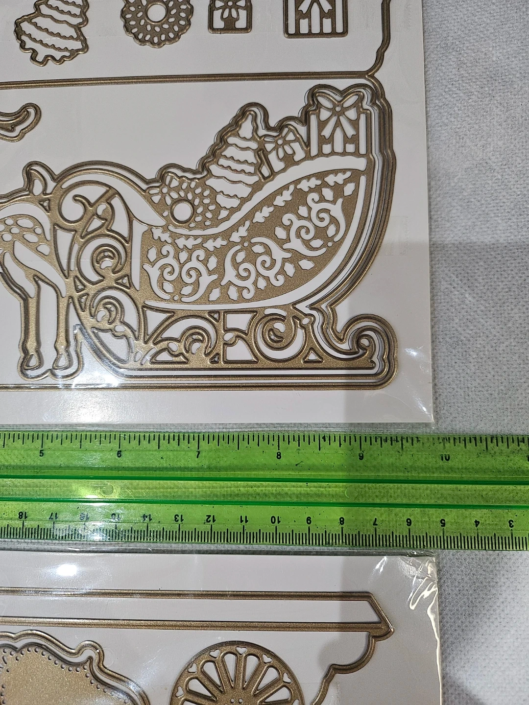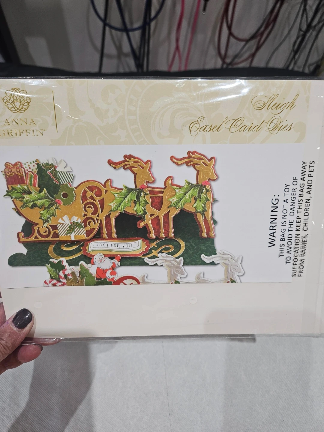This is a set of Anna Griffin Sleigh Easel Card Dies. It includes a sleigh, reindeer, and carriage designs. These dies are perfect for creating festive holiday cards!
