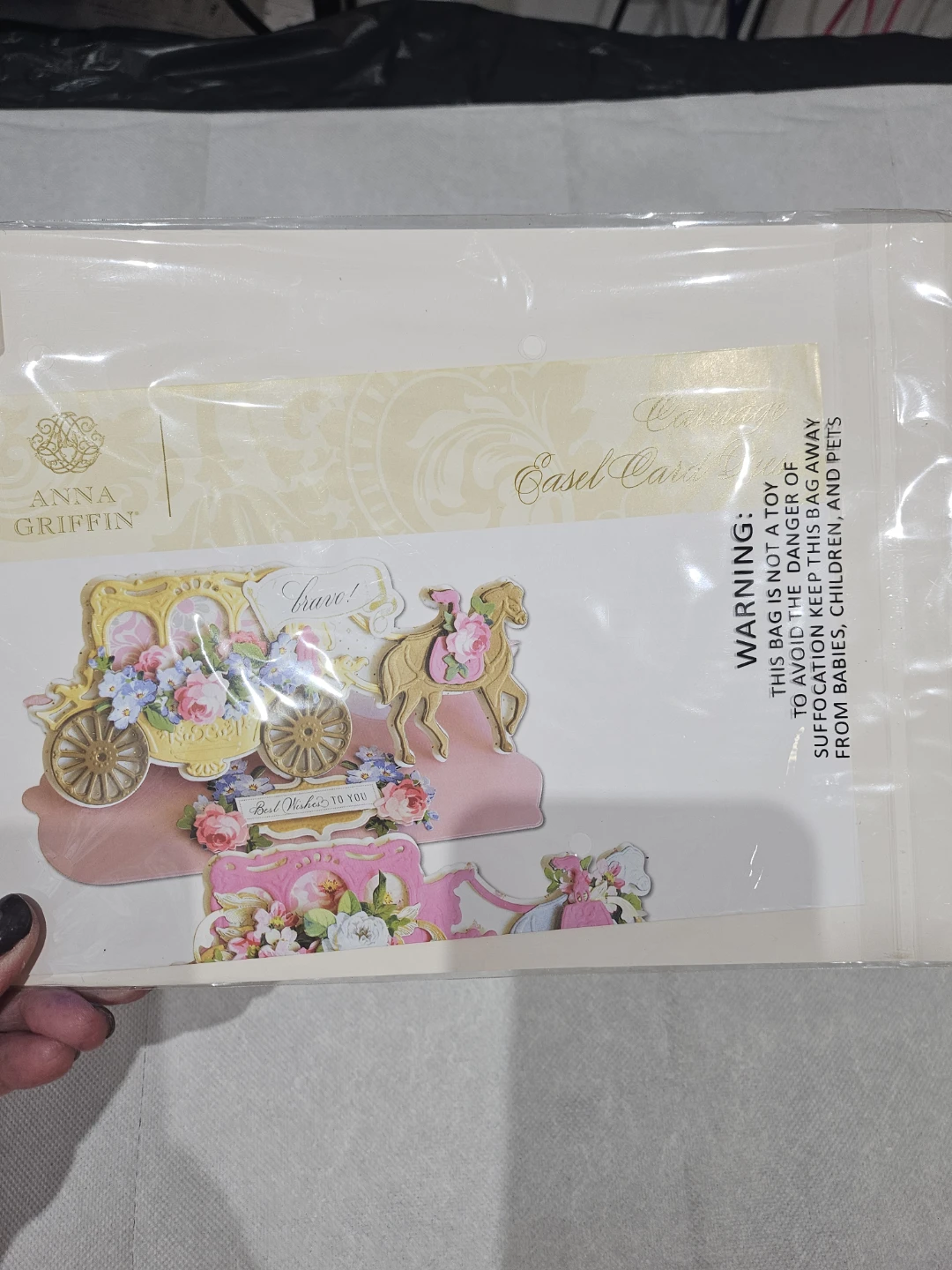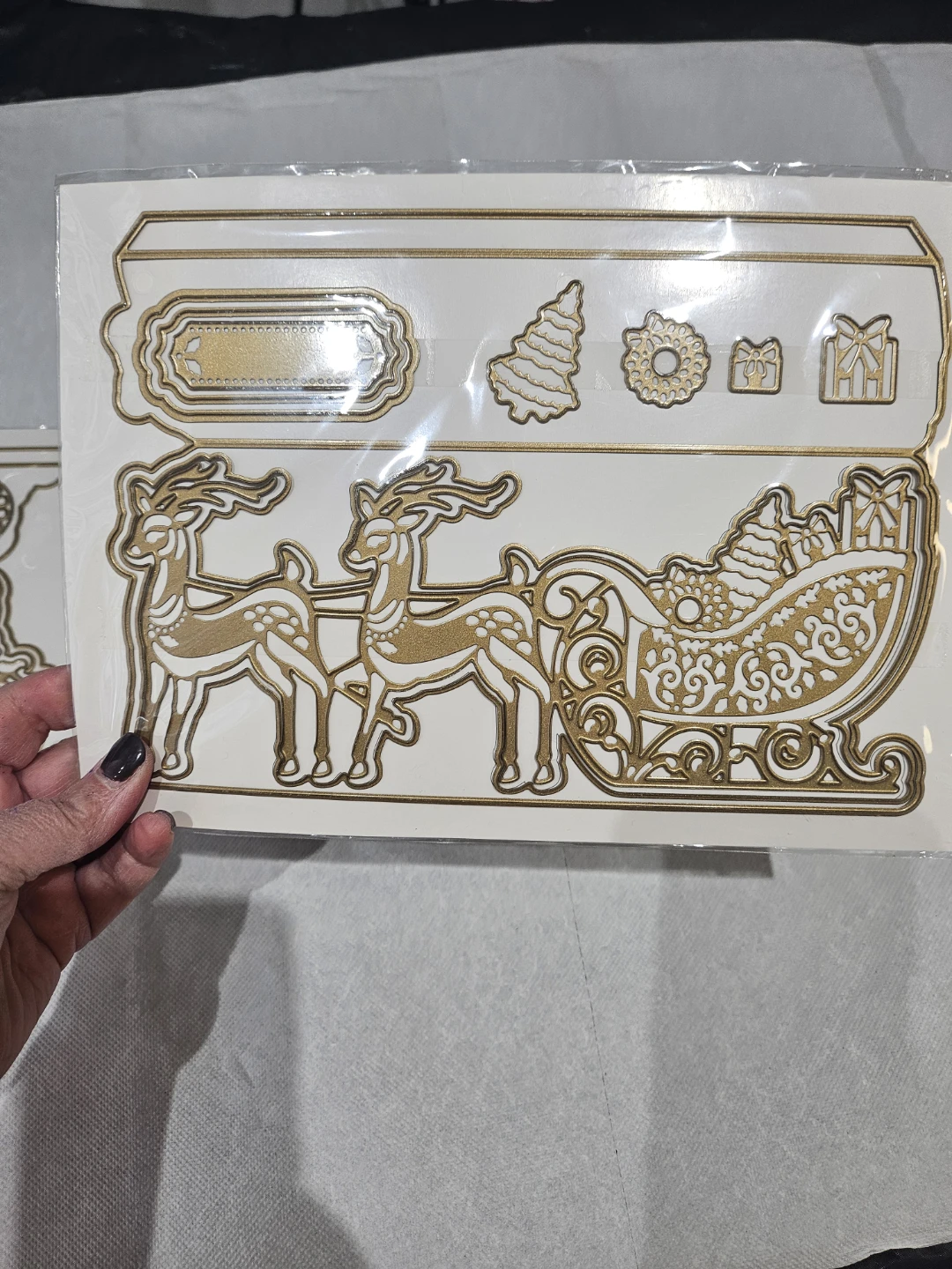 This is a set of Anna Griffin Sleigh Easel Card Dies. It includes a sleigh, reindeer, and carriage designs. These dies are perfect for creating festive holiday cards!