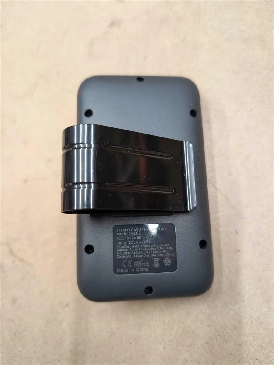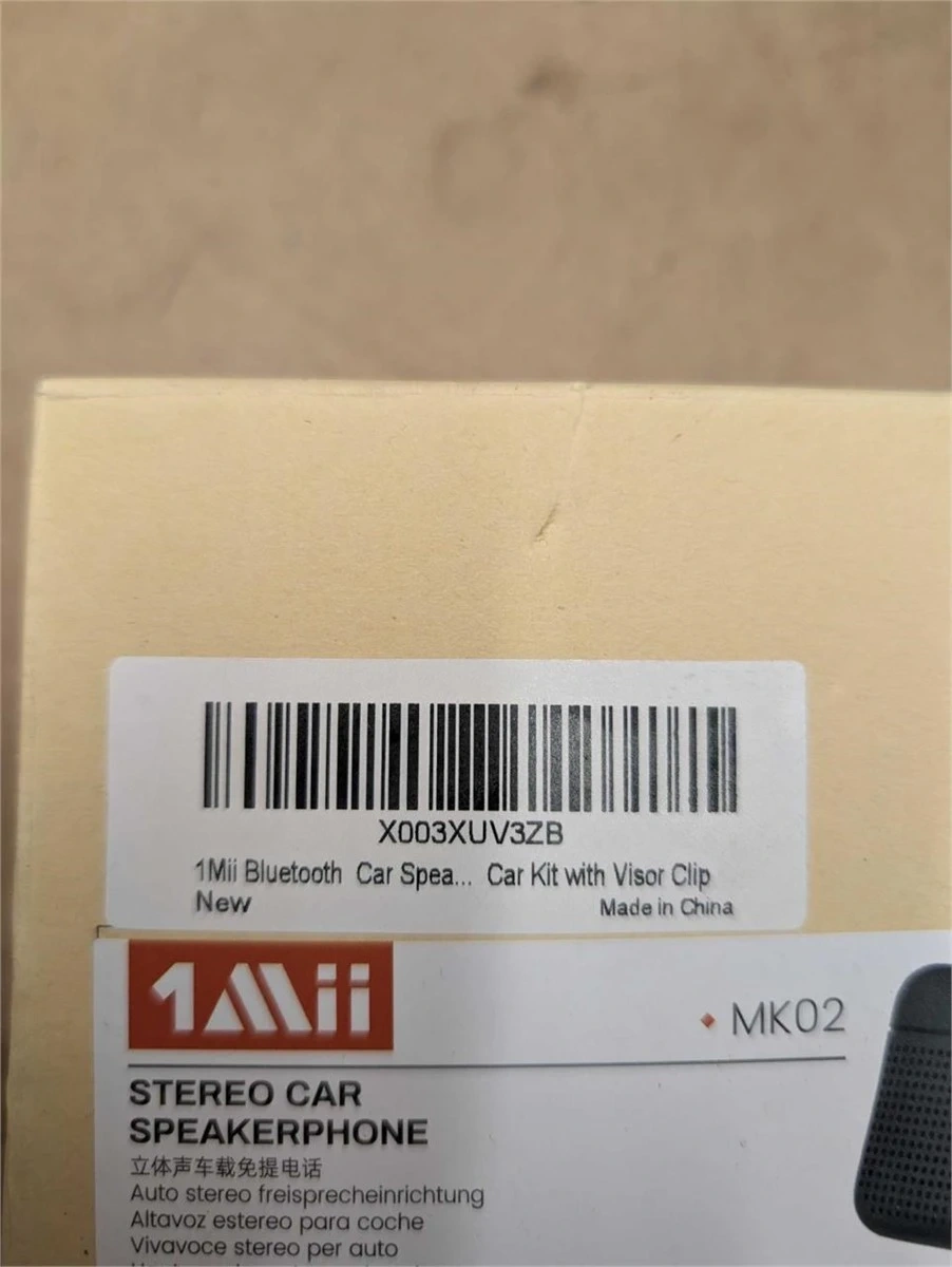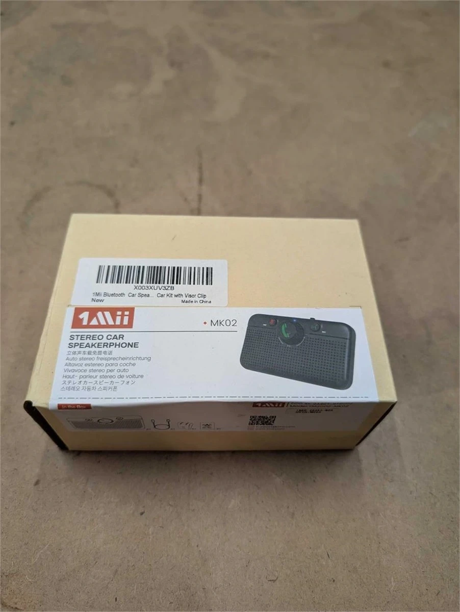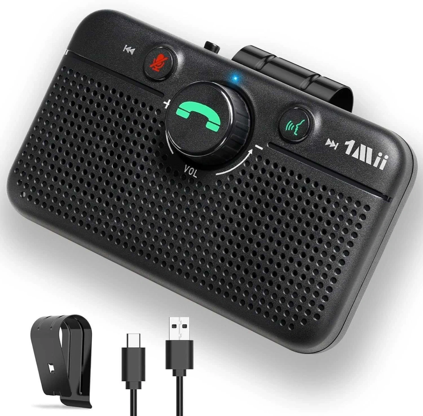 This is a 1Mii Stereo Car Speakerphone, model MK02. It's a hands-free device for your car. It includes a clip, USB-C cable, and USB-A cable for charging and connection.